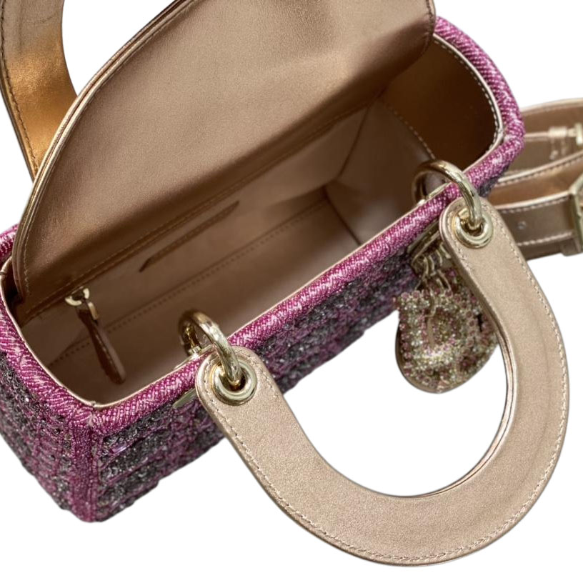 The Lady Dior bag epitomizes Dior’s vision of elegance and beauty. Demonstrating the House’s unique leather craftsmanship, embroidered with a multitude of beads in a hallmark Cannage design, while the top handles are crafted in tonal metallic lambskin. Pale gold-finish metal D.I.O.R. charms are adorned with white crystals, illuminating its silhouette. The miniature style, with its removable chain shoulder strap, can be carried by hand or worn crossbody and will be the ideal evening companion.