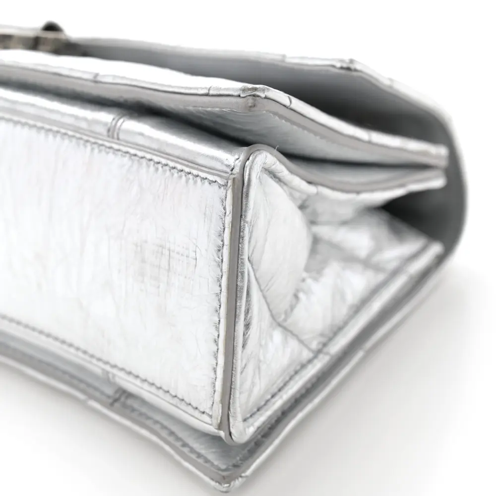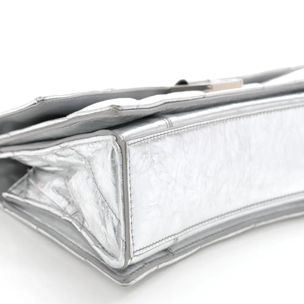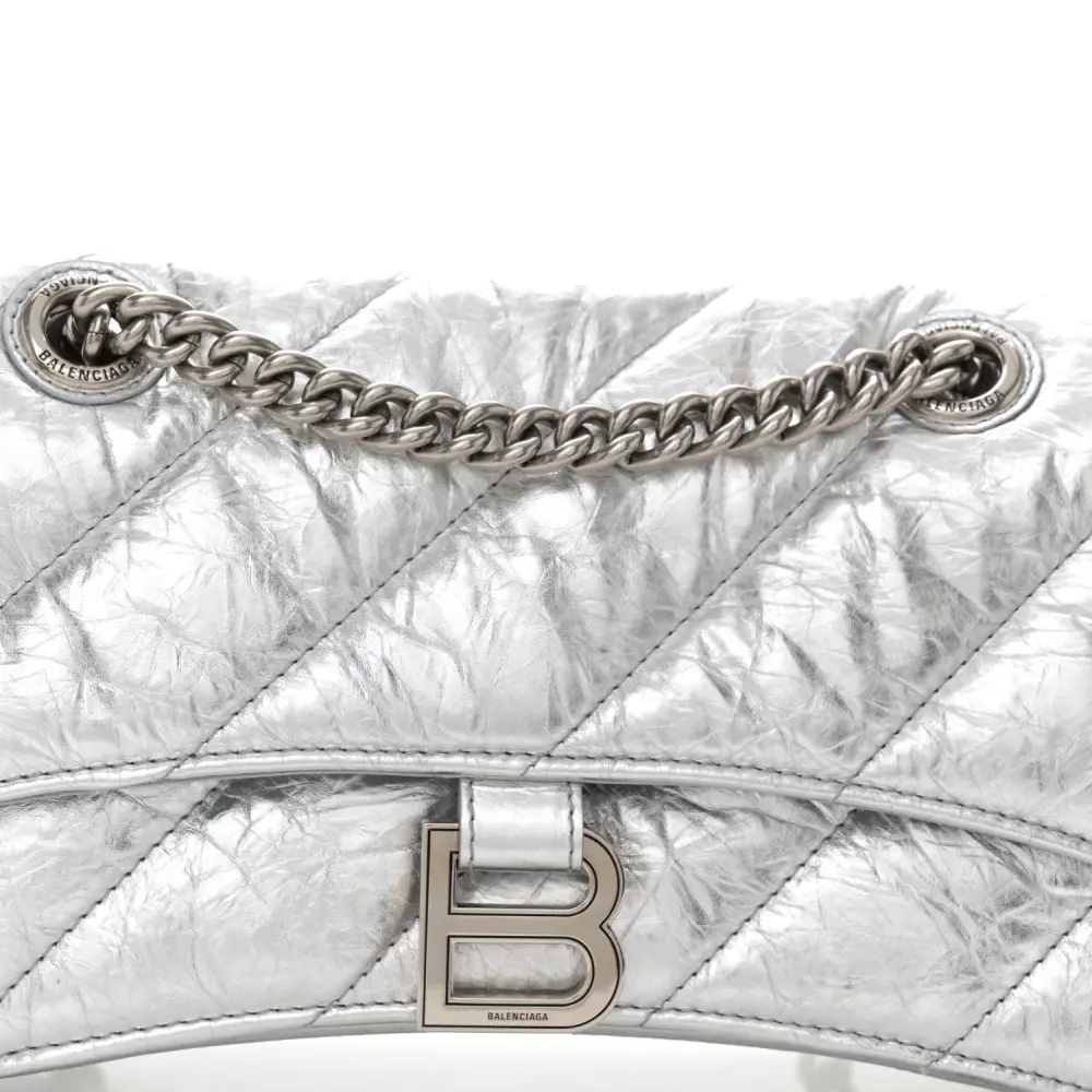 This Balenciaga Small Crush Chain Bag in Silver embodies luxury with its quilted crushed calfskin leather and silver hardware accents. The structured shape offers a versatile design with a detachable chain strap for crossbody or shoulder wear. Perfectly sized for essentials, it combines functionality with Balenciaga’s modern aesthetic. The soft texture and unique quilting add depth and elegance. Ideal for evening outings or casual chic ensembles, it stands as a sophisticated choice for any fashion-forward wardrobe. A true representation of Balenciaga’s innovative craftsmanship.