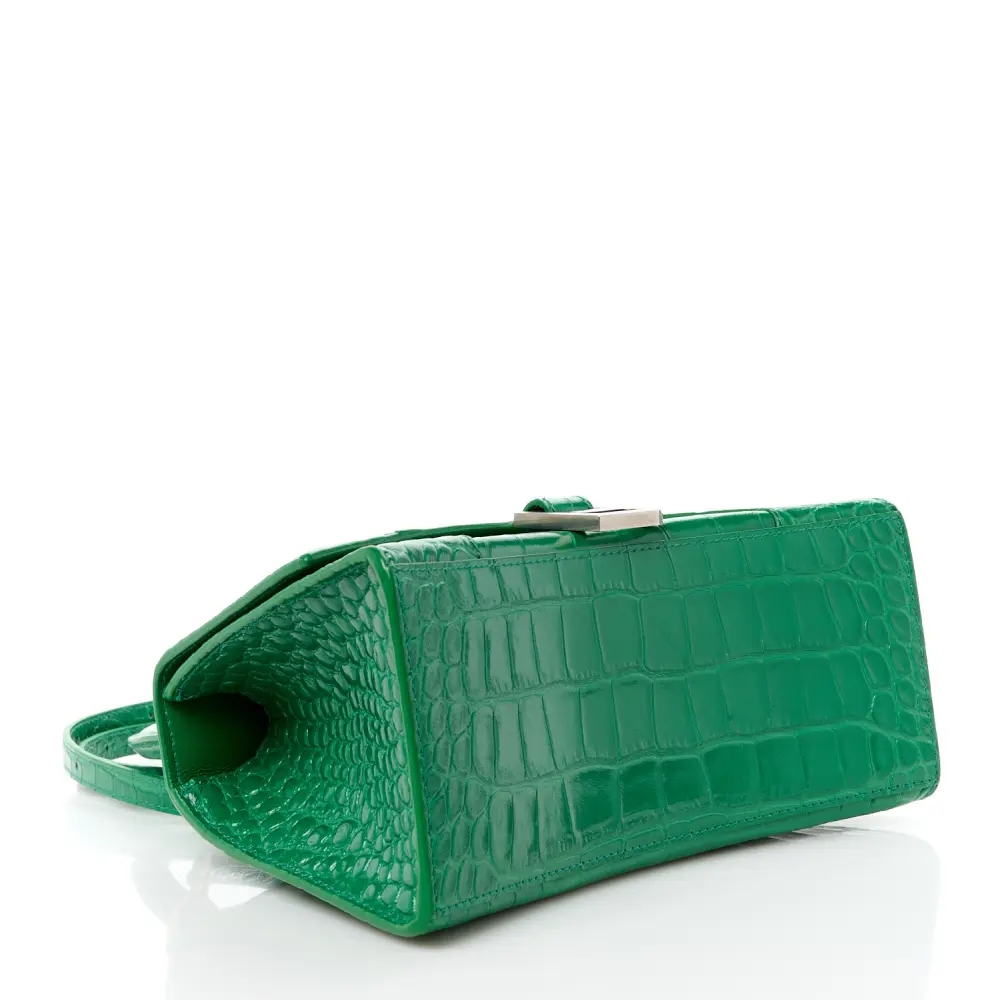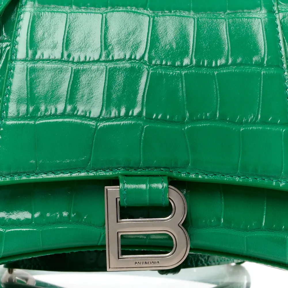 Balenciaga Small Hourglass Top Handle Bag Leaf Green Crocodile Embossed Shiny Calfskin Leather Silver Hardware
