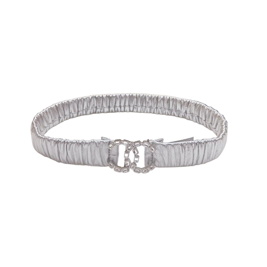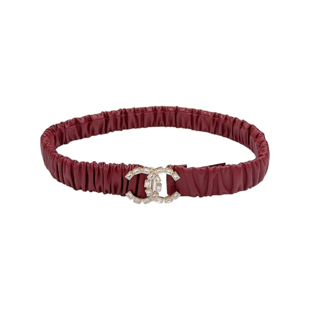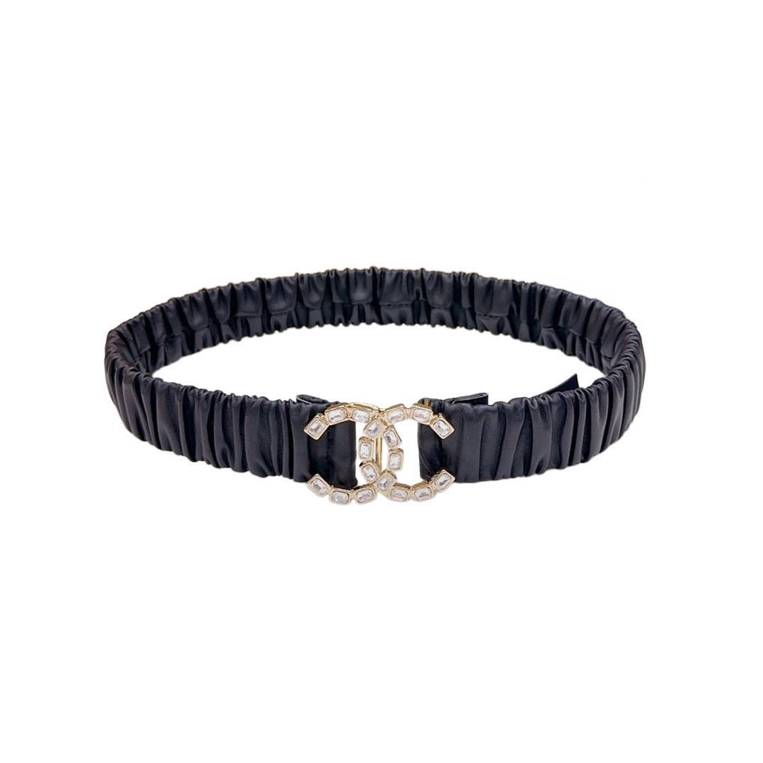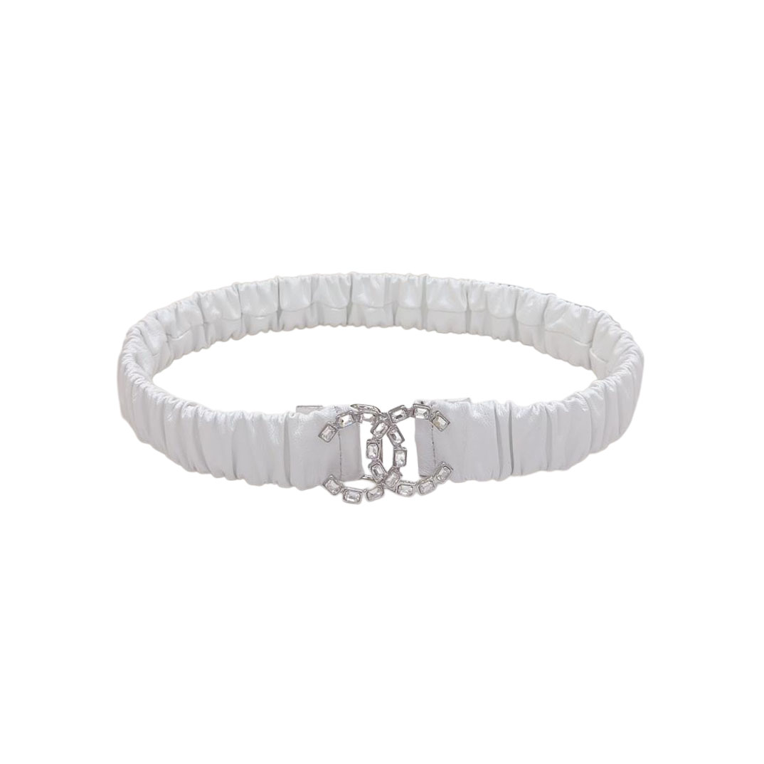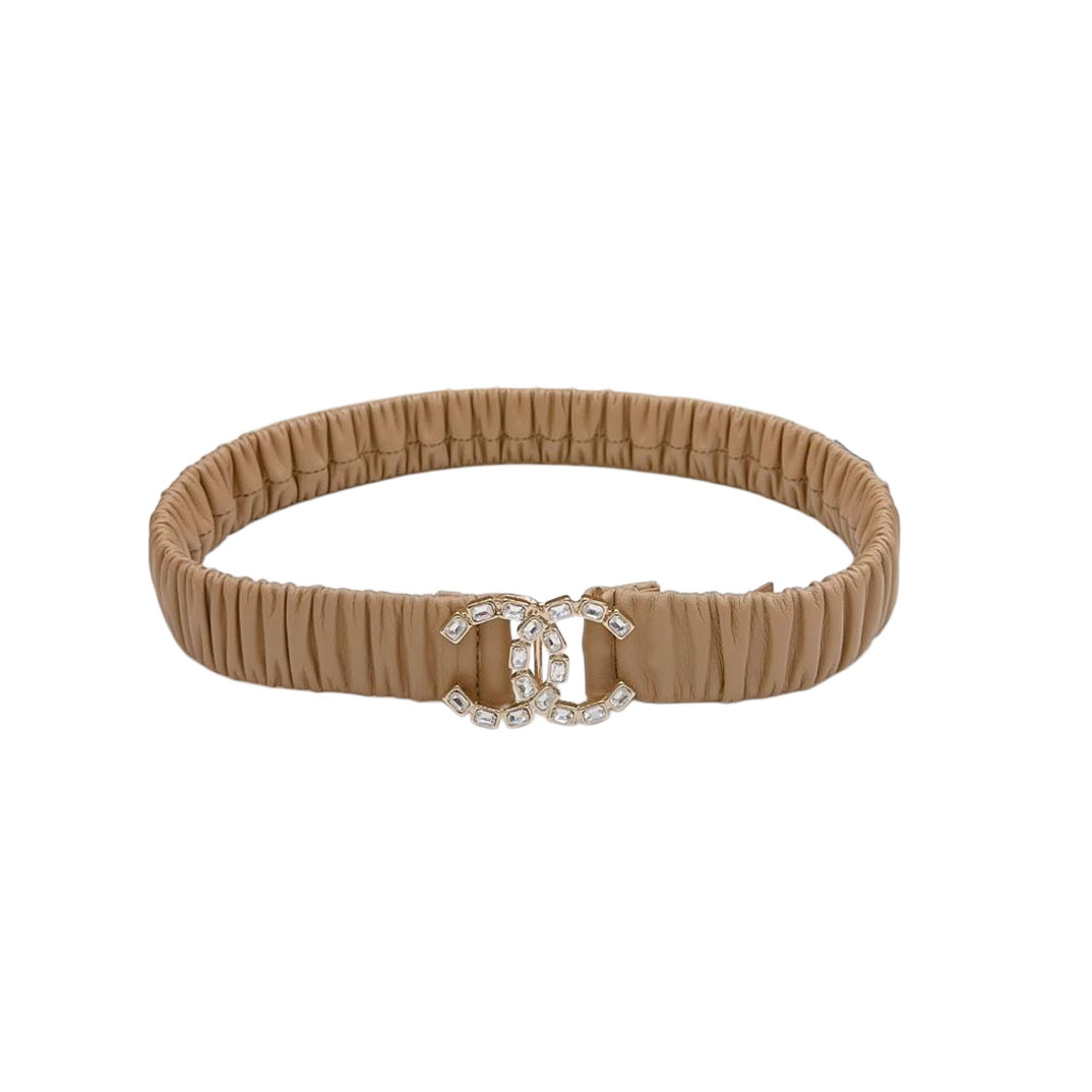 Chanel Women’s CC Crystal Buckle Elastic Belt In Champagne Gold/Beige/Black/Red/Silver/Ivory/White Lambskin With Gold/Silver Hardware 30mm