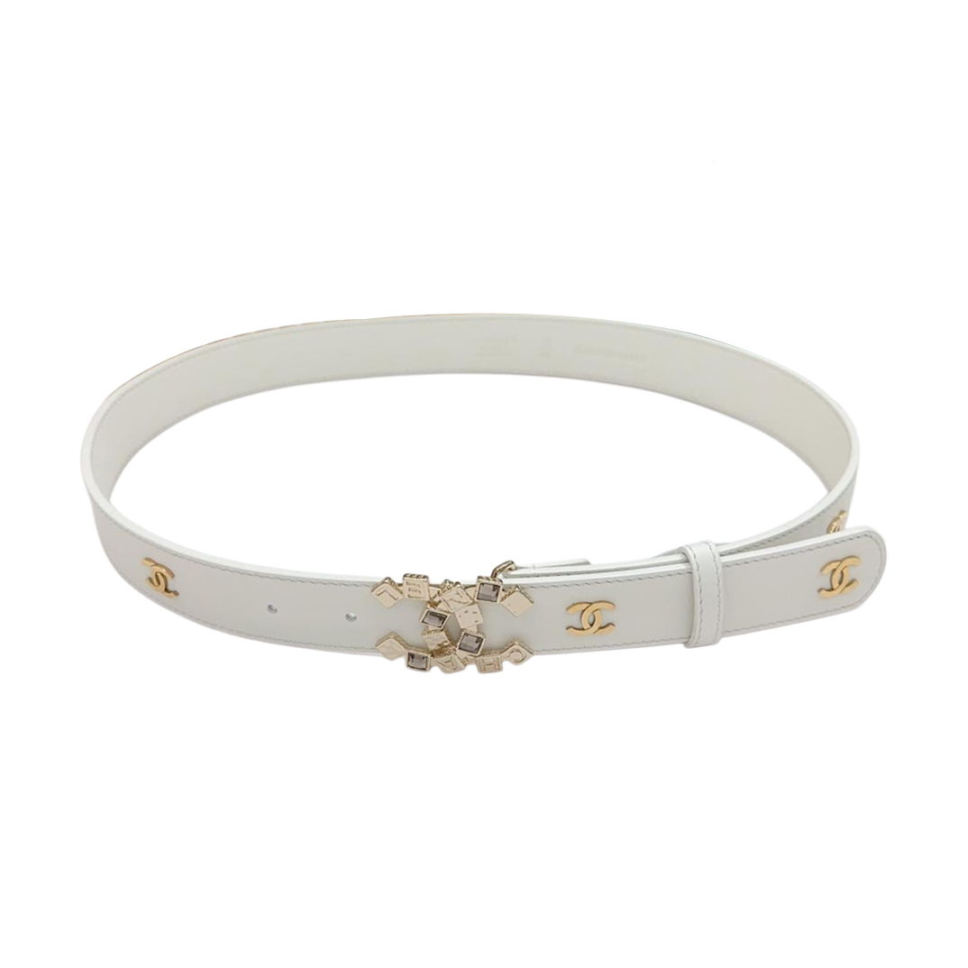 Chanel Women’s Decorative CC Buckle Belt In White/Black Calfskin With Gold Hardware 30mm