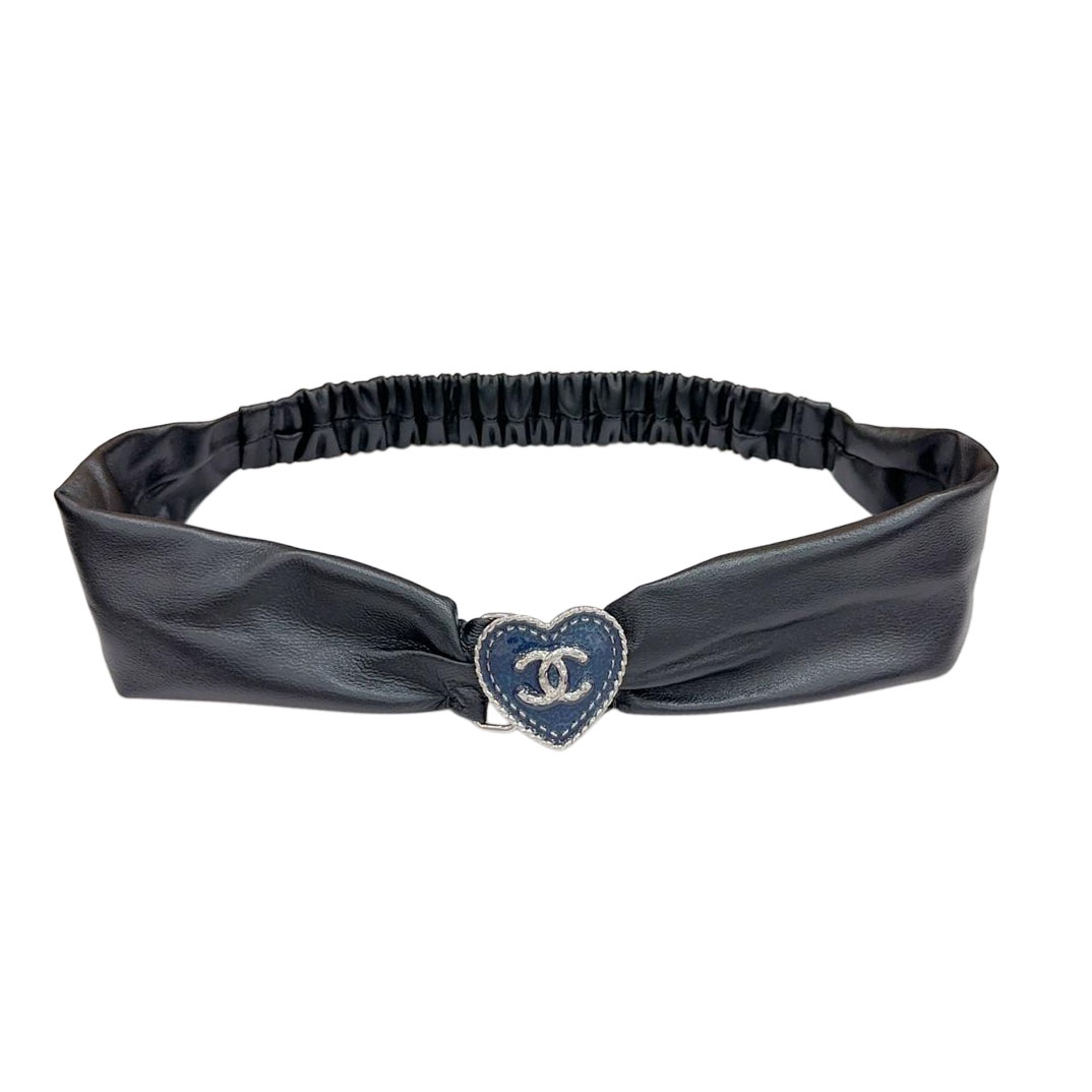 Chanel Women’s Heart Buckle Elastic Belt In Black/White Lambskin With Silver Blue Hardware 50mm