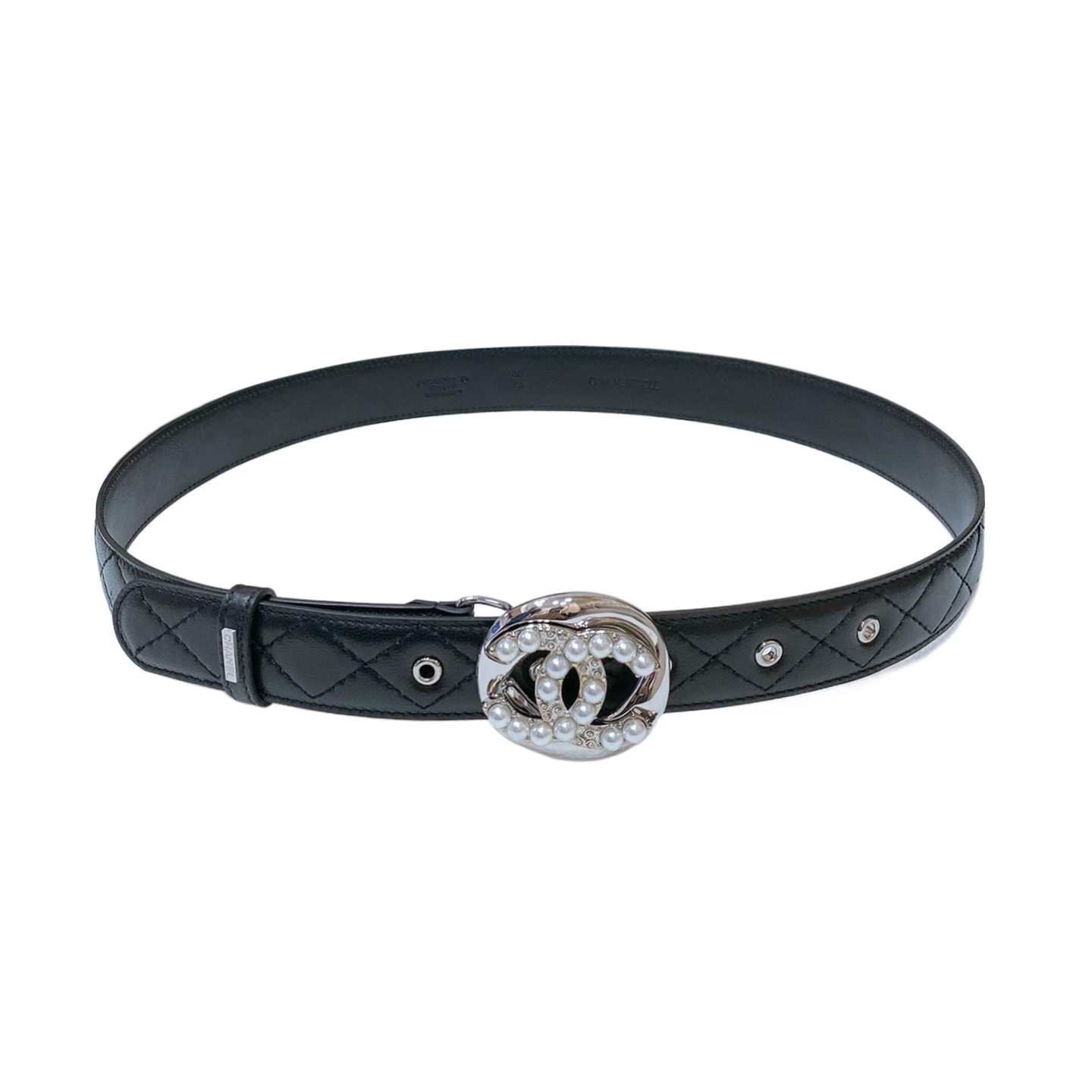 Chanel Women’s Pearls CC Belt In Blue/Black/White Lambskin With Gold/Silver Hardware