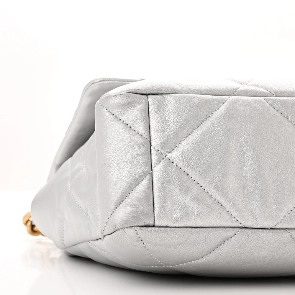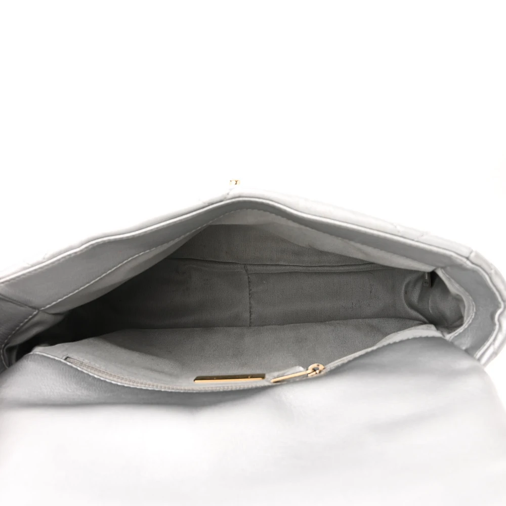 This Chanel Flap Large Chanel 19 in Metallic Silver Quilted Lambskin Leather with Mixed Metal Hardware is a striking and innovative bag. The metallic silver lambskin leather adds a futuristic touch, while the quilted design maintains Chanel iconic elegance. Mixed metal hardware enhances its bold aesthetic, perfect for making a statement. Spacious and practical, ideal for both daily wear and special occasions. The oversized CC clasp adds a signature detail. A must-have for those who love standout luxury.