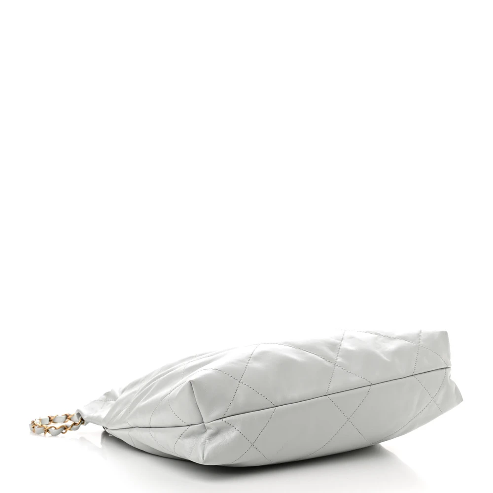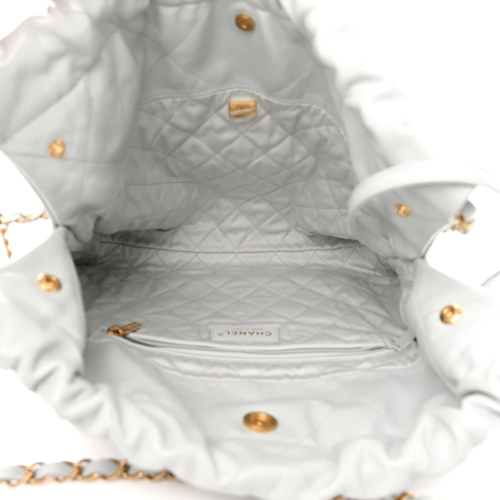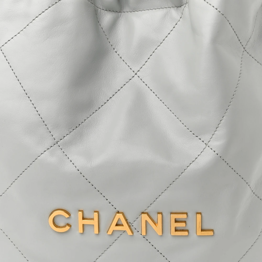 This Chanel Small Chanel 22 in Light Blue Quilted Shiny Calfskin Leather with Gold Hardware is a bold and modern handbag. The shiny calfskin leather and quilted design create a striking and luxurious aesthetic. Gold hardware adds a touch of sophistication, enhancing its sleek silhouette. Spacious enough for daily essentials, it blends functionality with high fashion. The drawstring closure ensures security, while the adjustable strap offers versatility. A contemporary piece for the fashion-forward individual.