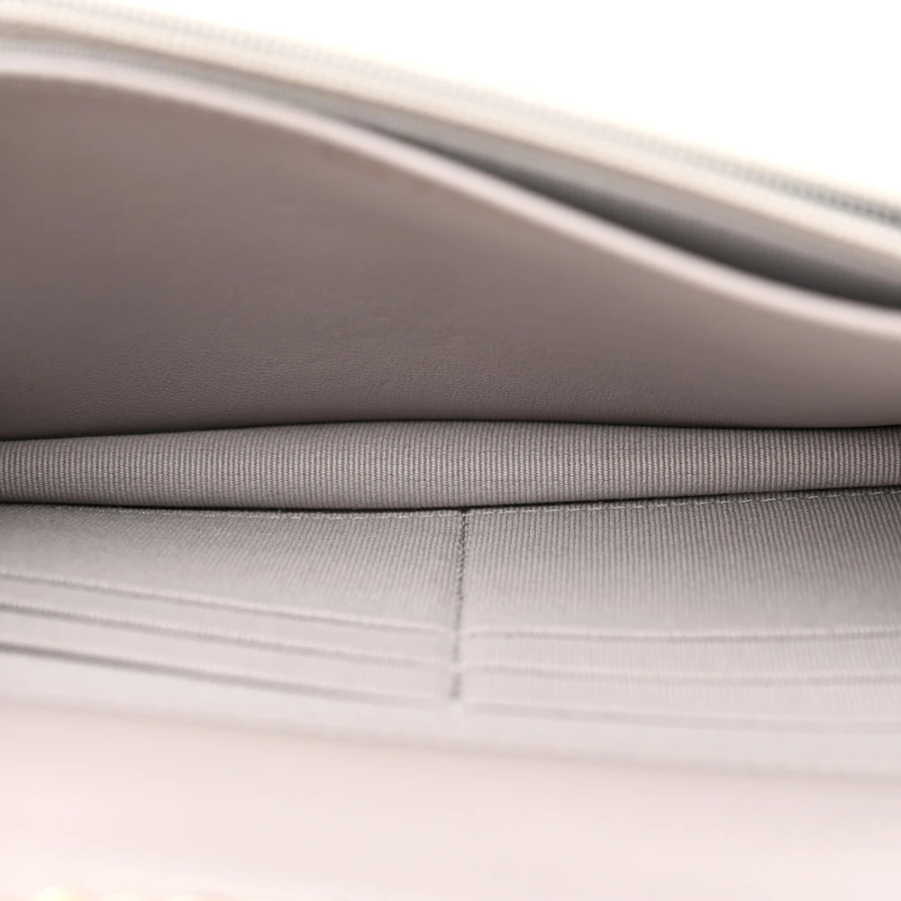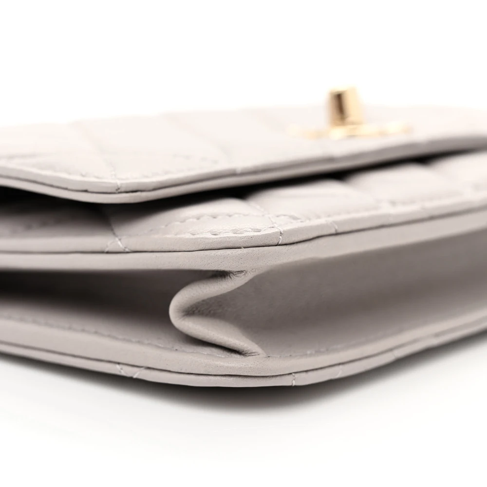 This Chanel Trendy CC Wallet On Chain (WOC) Small in Grey Quilted Lambskin Leather with Gold Hardware is a blend of elegance and functionality. The lambskin leather is soft to the touch, featuring Chanel signature quilted design. Gold hardware adds a refined and luxurious finish to its sophisticated silhouette. Compact yet practical, it offers organized space for essentials. The versatile chain strap allows for crossbody or shoulder wear. A chic and timeless piece for any occasion.