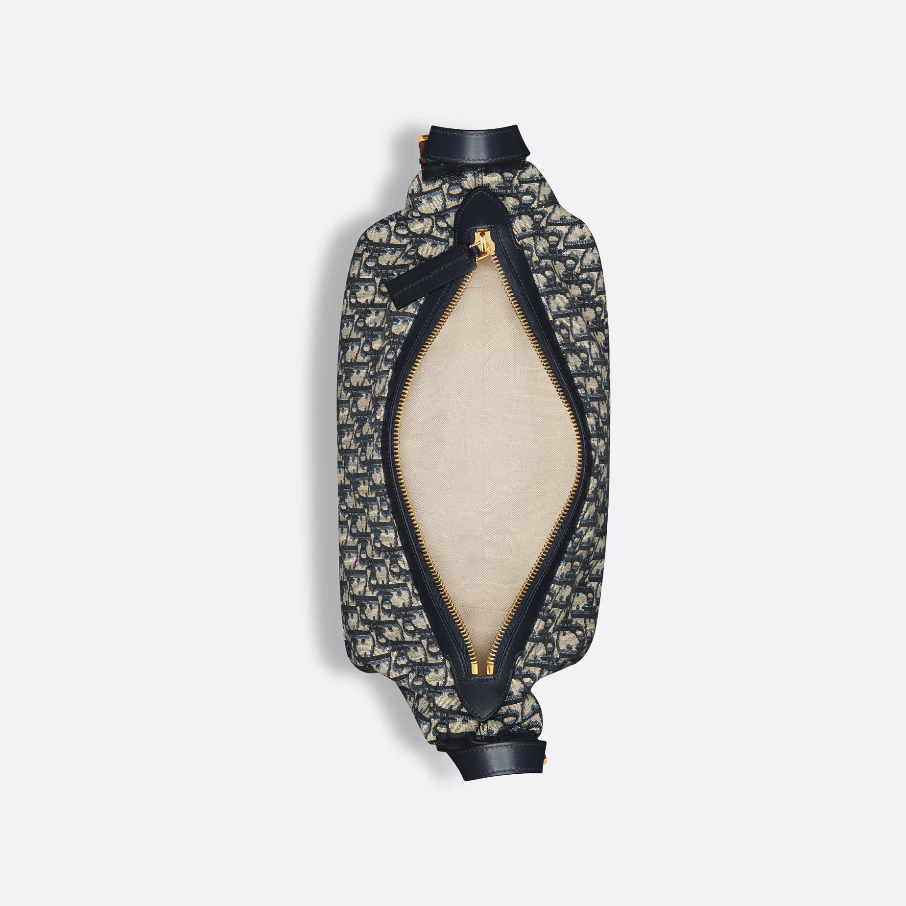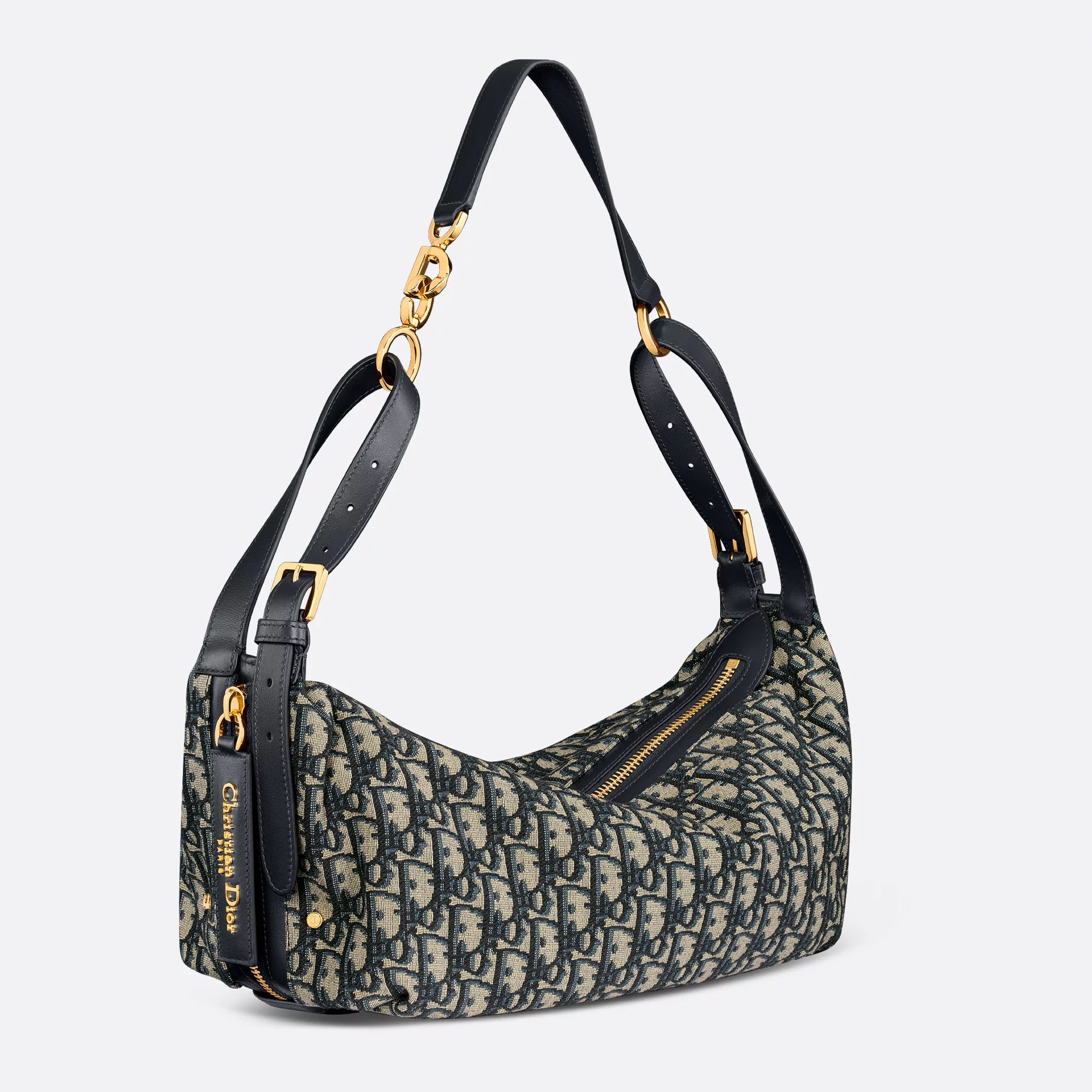 The D-Journey bag showcases a hobo silhouette with a modern and supple design. The blue Dior Oblique jacquard style features a main compartment with a zip pocket, while two decorative side pockets showcase a large leather pull with the Christian Dior Paris signature. Equipped with adjustable leather top handles and a leather strap, the medium D-Journey bag can be carried by hand, worn over the shoulder or crossbody as a daily companion.