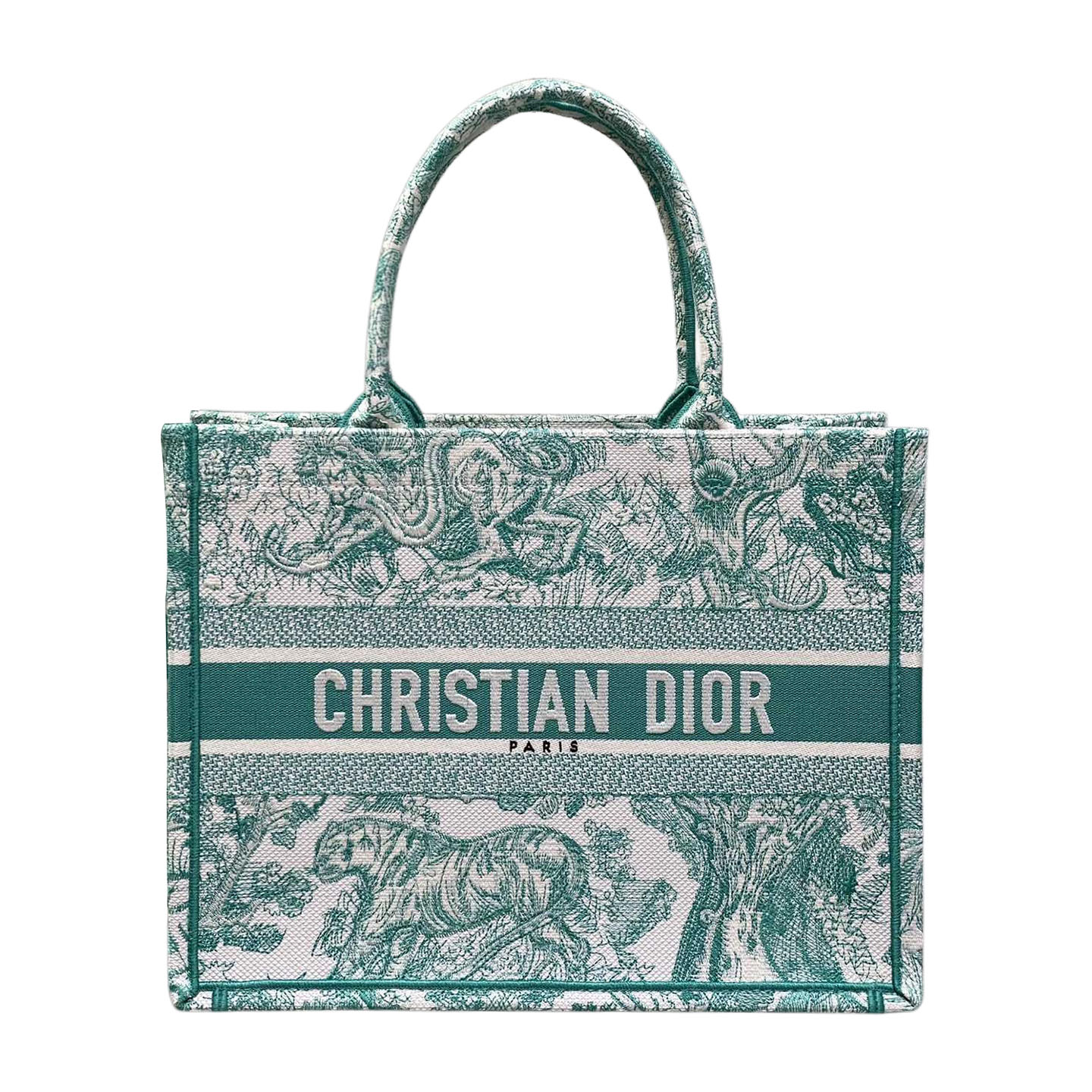 Part of the Dioriviera capsule, the Dior Book Tote is a House classic designed by Maria Grazia Chiuri, Creative Director of Christian Dior. Created to hold the daily essentials, the style is fully embroidered with the white and Blue/Yarrow Pink/Green/Pink Toile de Jouy Sauvage motif, a new take on the House’s hallmark pattern. Adorned with the Christian Dior Paris signature on the front, the medium tote exemplifies Dior’s savoir-faire and may be carried by hand or worn over the shoulder.