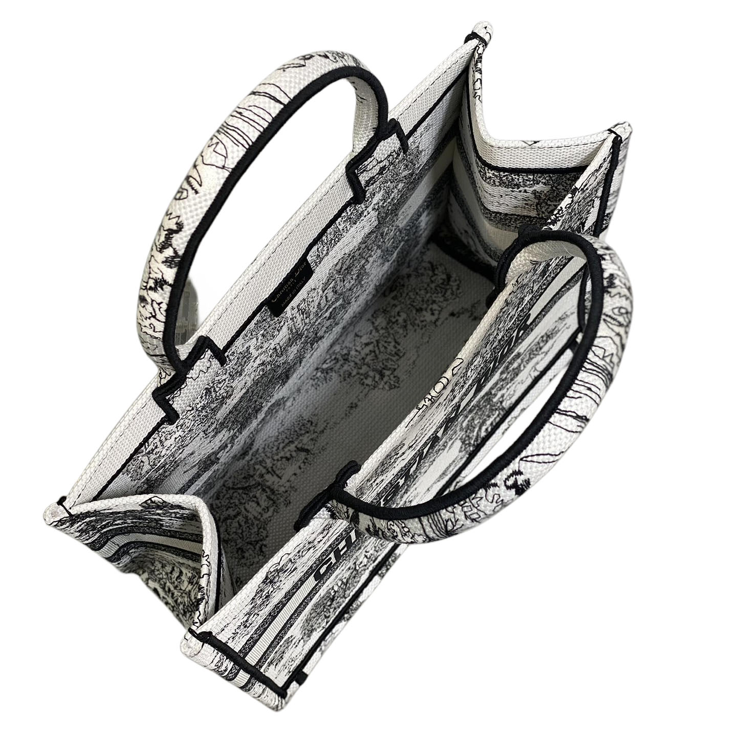 This Dior Medium Book Tote in White And Black Toile de Jouy Scotland Motif Embroidery is an artistic and luxurious statement. Spacious and lightweight, it’s perfect for travel or daily use. The intricate embroidery showcases Dior’s exceptional craftsmanship. A bold addition for those seeking unique accessories.