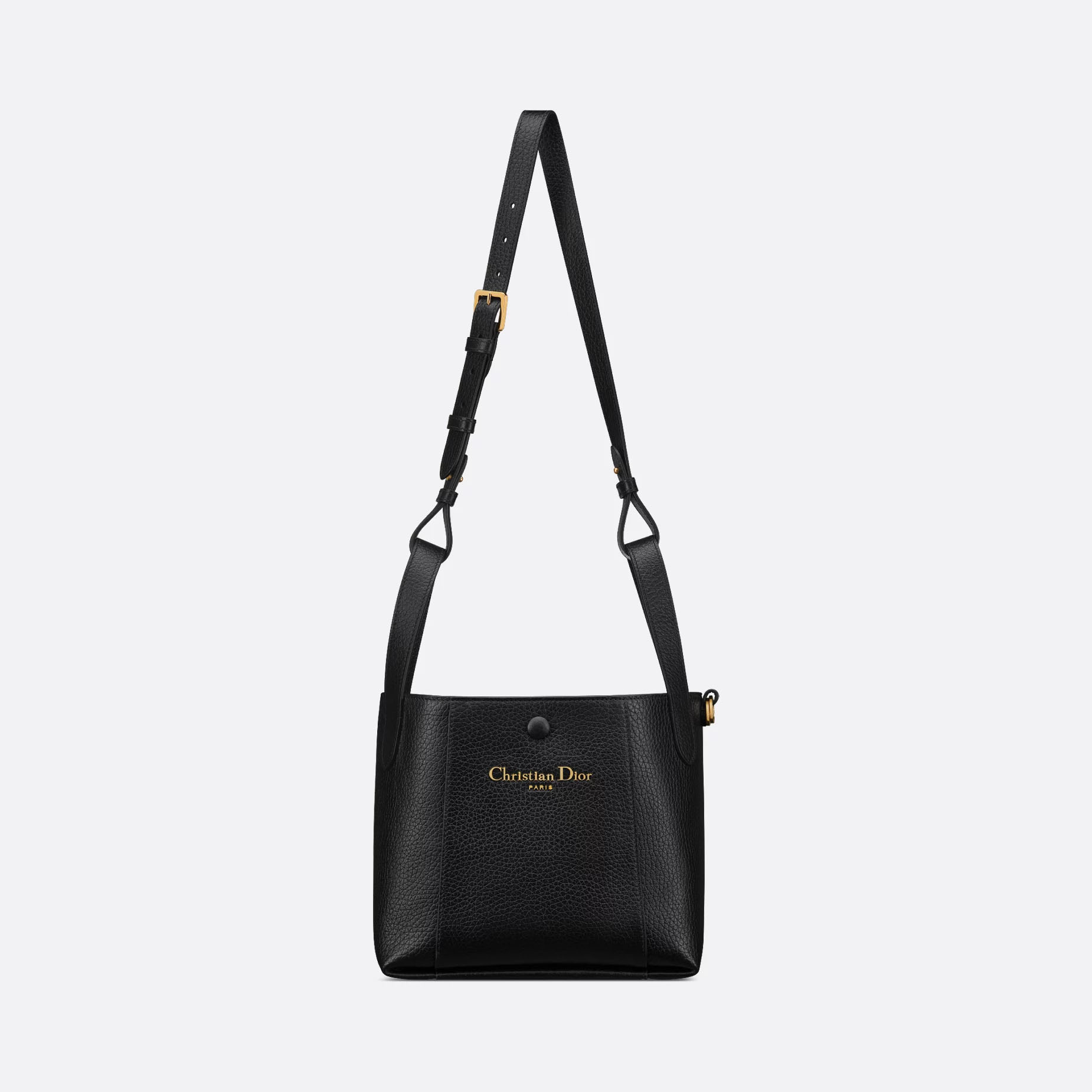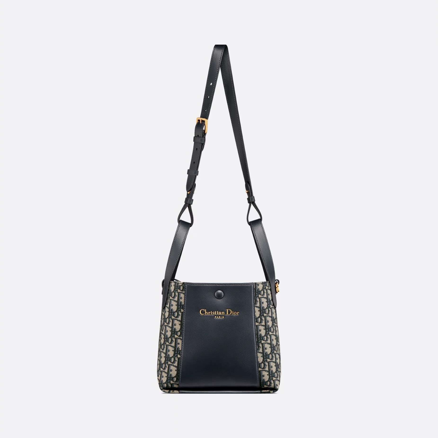 New for Summer 2025, the Signature bucket bag showcases a supple silhouette and versatile design. Crafted in blue Dior Oblique jacquard embellished with tonal smooth calfskin/Black Grained Calfskin , it is adorned with an antique gold-finish metal Christian Dior Paris signature on the front. The spacious compartment, equipped with a snap and tab to secure the essentials, is completed by a slip pocket. The leather top handles and adjustable, removable strap allow the small bag to be effortlessly carried by hand, worn over the shoulder or crossbody.