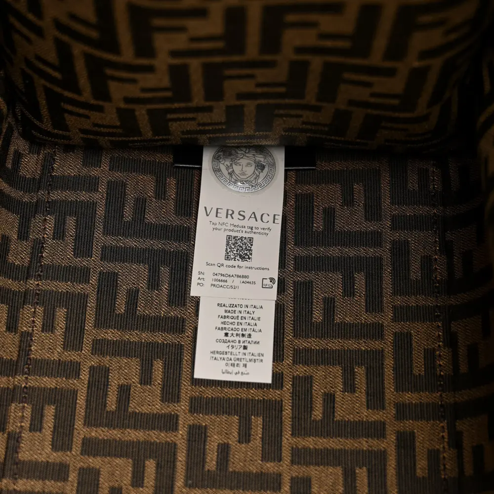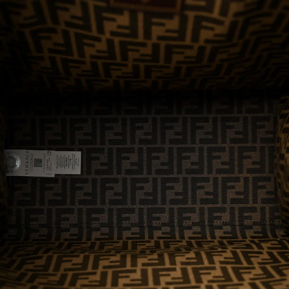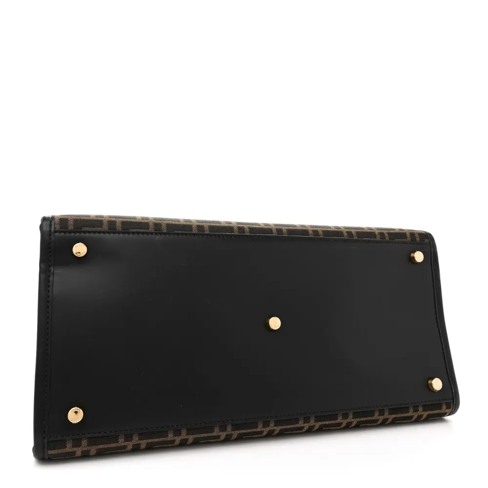This Fendi Large Fendace FF Medusa Studded Fendi Sunshine Shopper Tote in B rown luxurious. Jacquard Fabric, Calfskin Leather, and Plexiglass create a striking mix. Gold hardware enhances its unique design. Spacious and functional, it’s perfect for carrying essentials in style. A true statement piece for standout looks. Perfect for fashion-forward individuals.