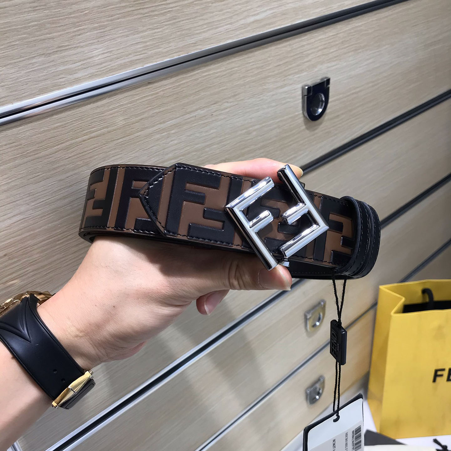 Fendi Men’s FF Diamonds Belt In Brown/Black Calfskin With Gold/Silver/Black Hardware 38mm