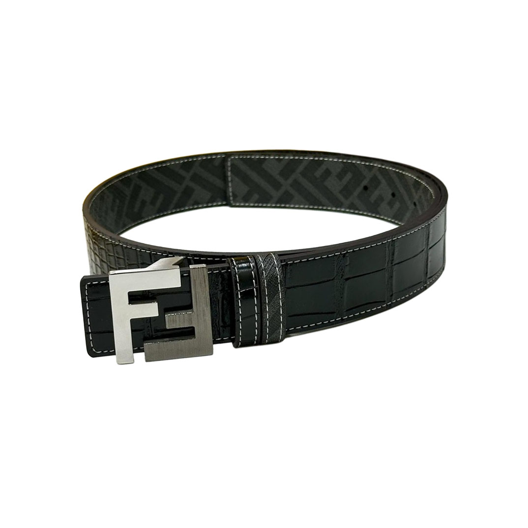 Fendi Men’s Squared FF Buckle Belt In Black Crocodile-Embossed Calfskin And Monogram Canvas With Gold/Silver/Gun Black Hardware 40mm