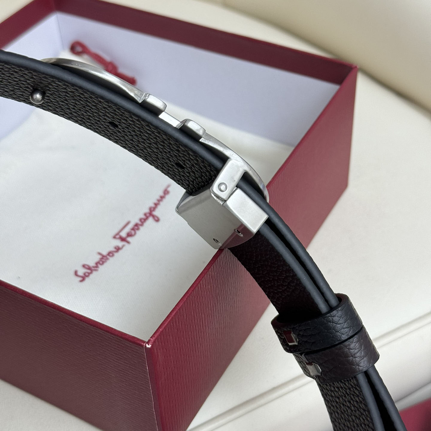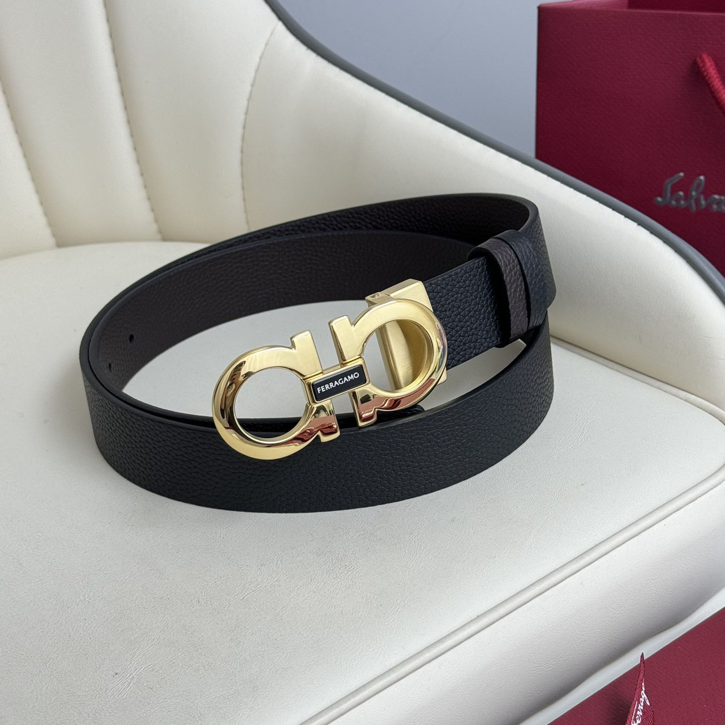 Ferragamo Men’s Double Gancini Buckle Belt In Black Grained Calfskin With Gold/Silver/Black Hardware 35mm