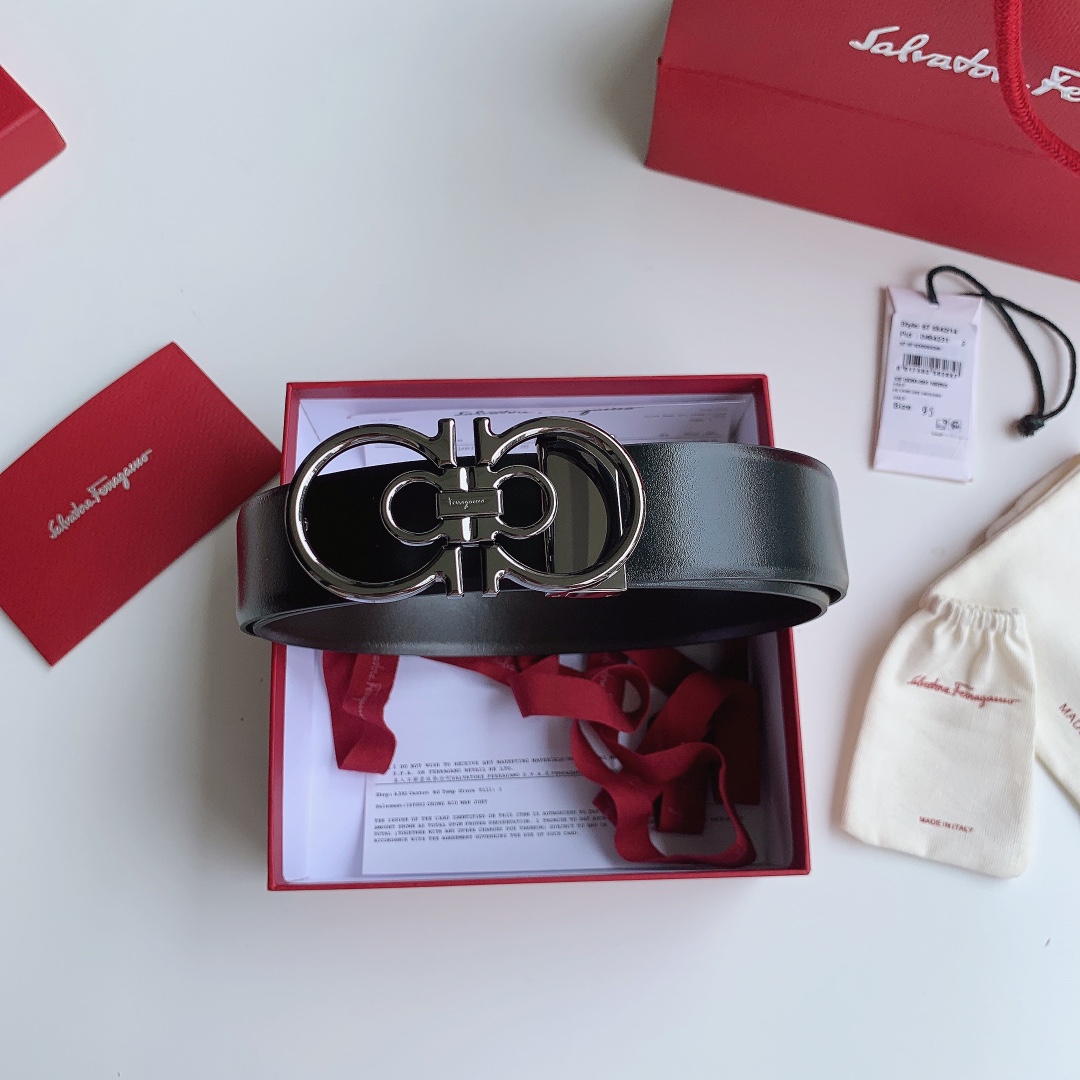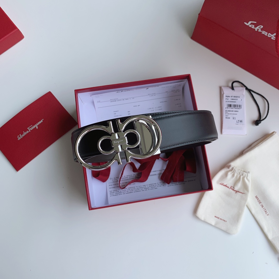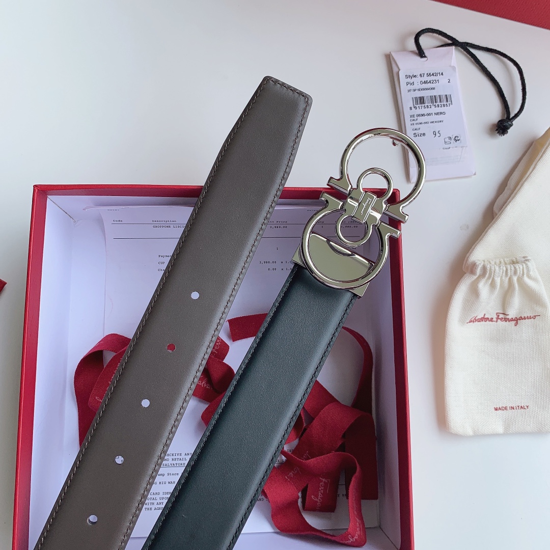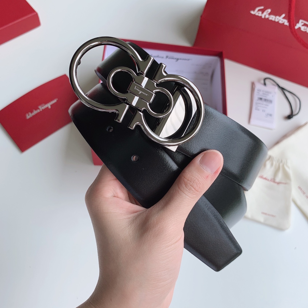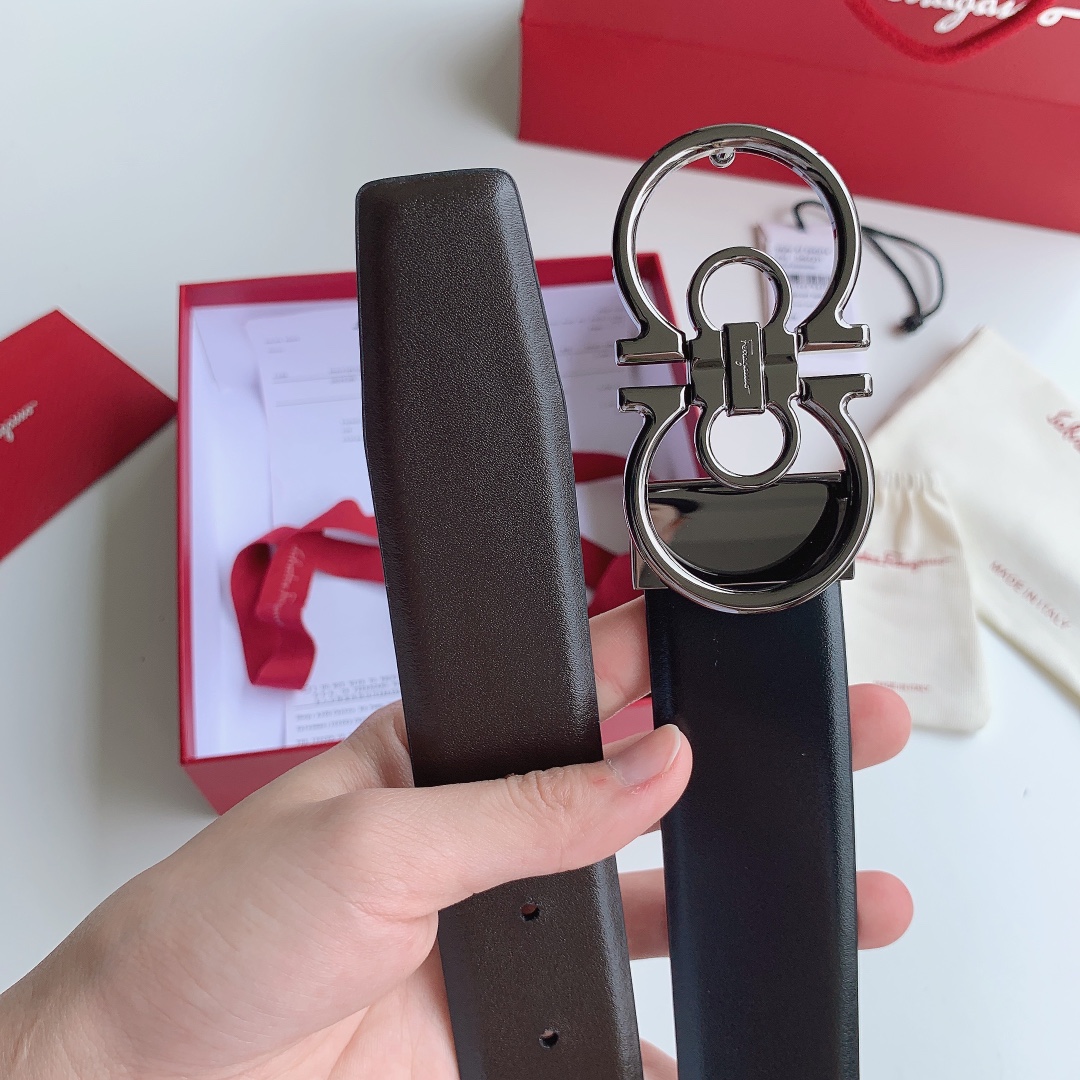 Ferragamo Men’s Double Gancini Buckle Reversible Belt In Black/Brown/Coffee Calfskin With Gold/Silver/Black Hardware 35mm