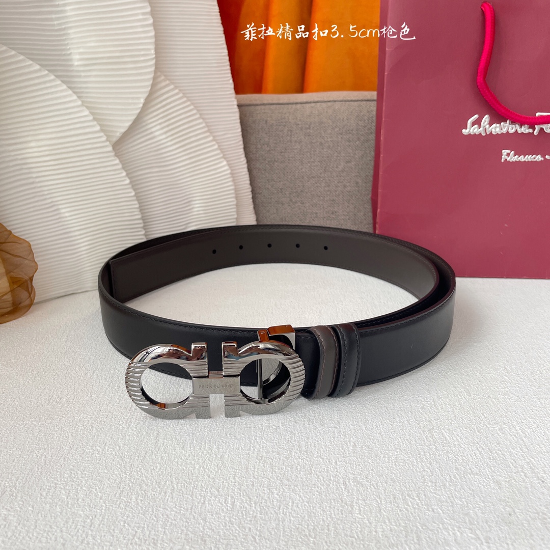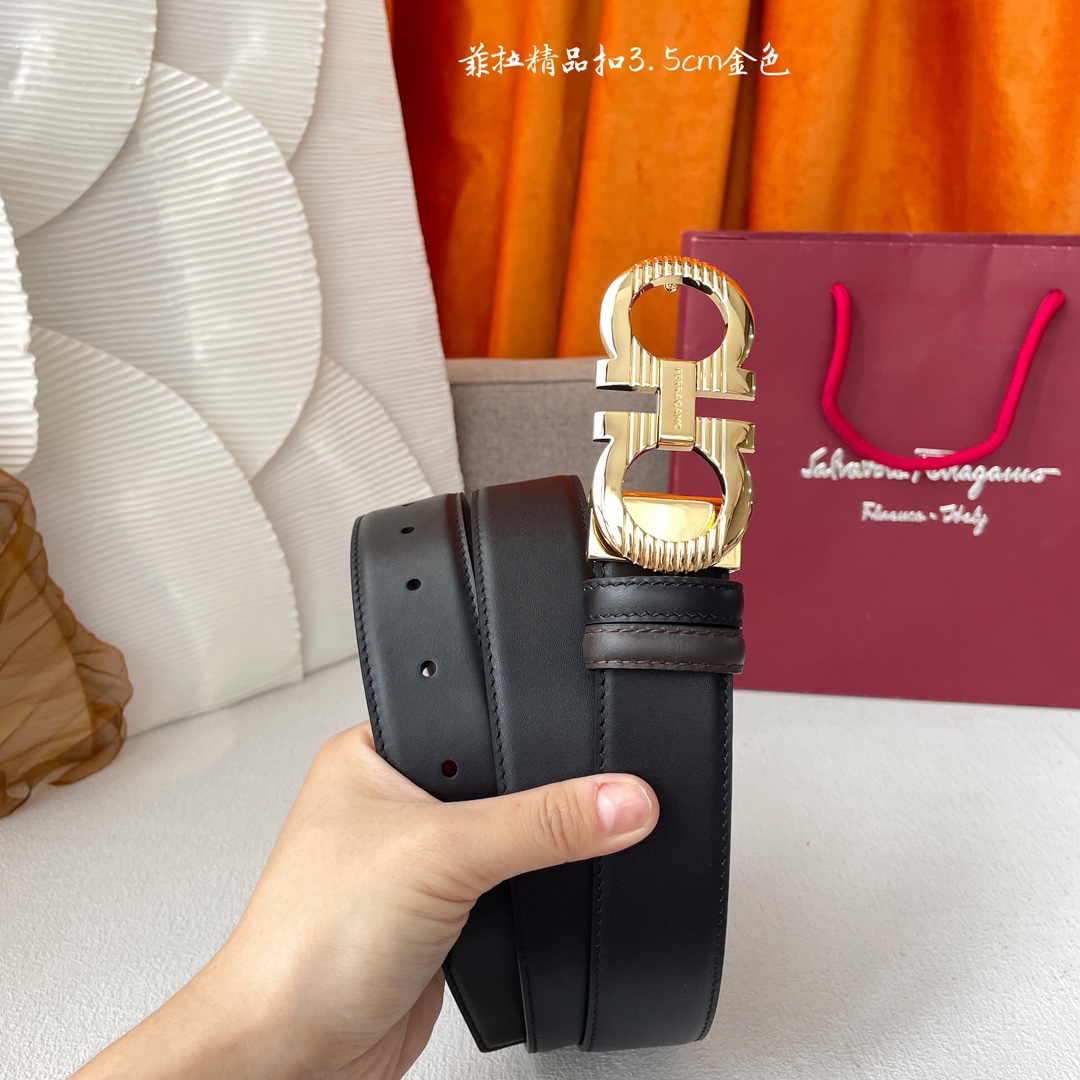 Ferragamo Men’s Double Gancini Buckle Reversible Belt In Black/Coffee Smooth Calfskin With Gold/Silver/Black/Gun Black Hardware 35mm