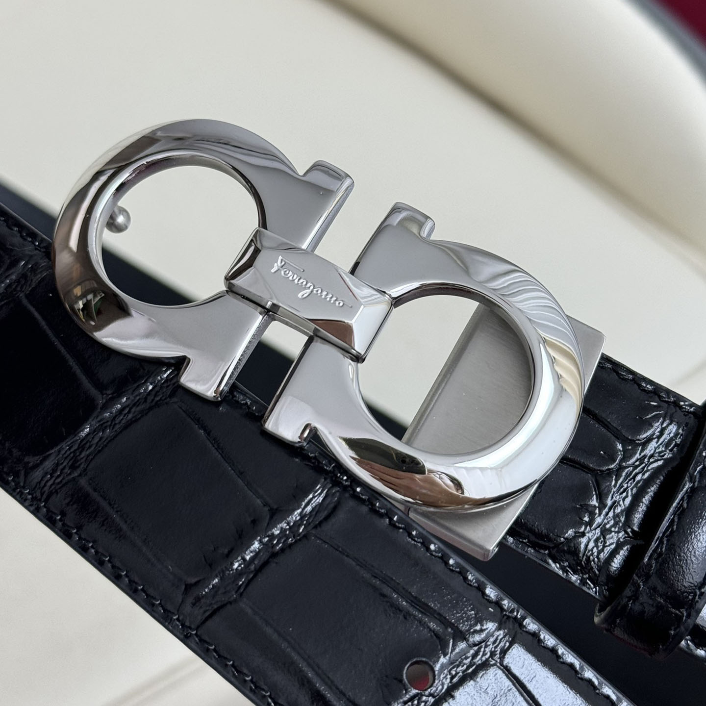 • Ferragamo Men’s Double Gancini Buckle Reversible Belt In Black Crocodile-Embossed Calfskin With Gold/Silver/Black Hardware 35mm