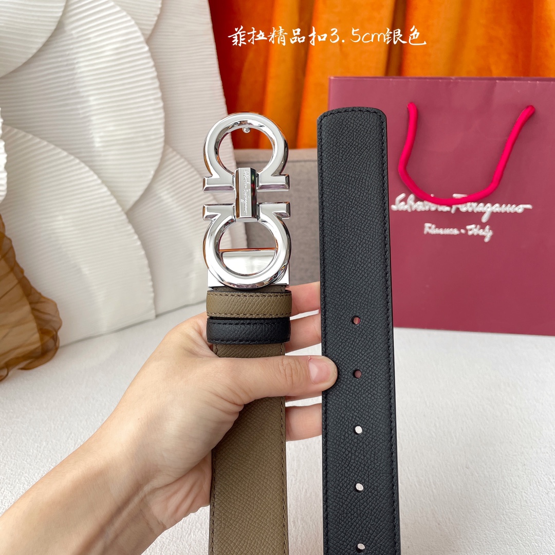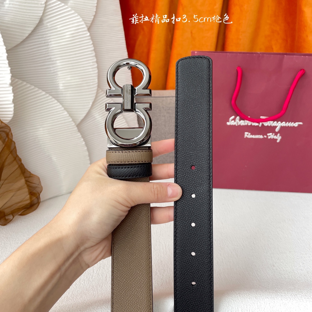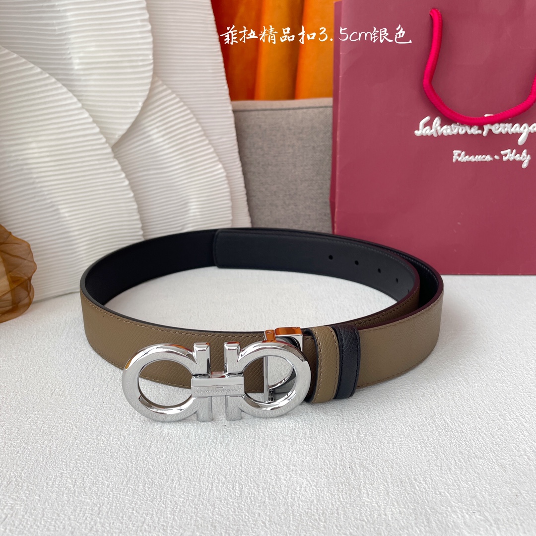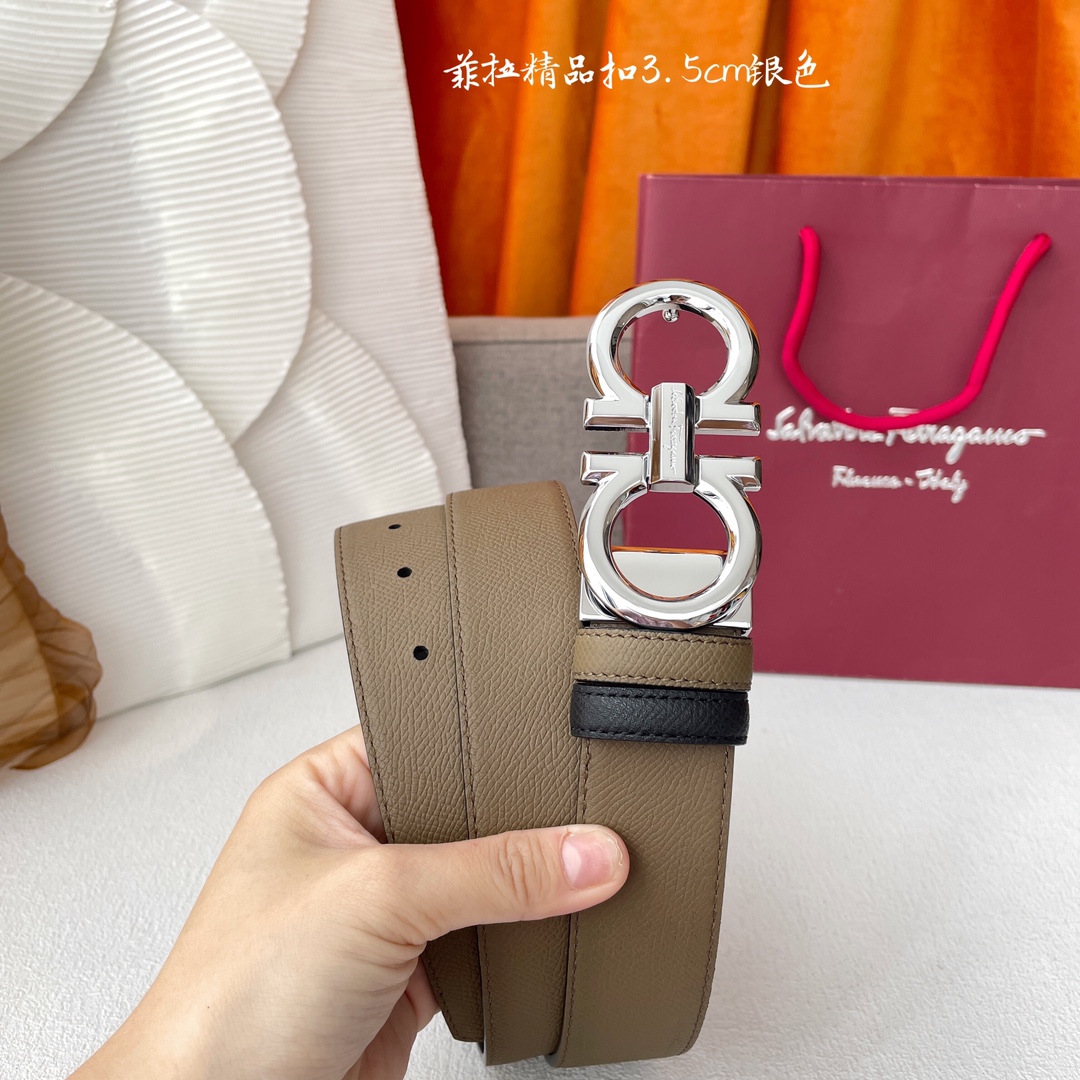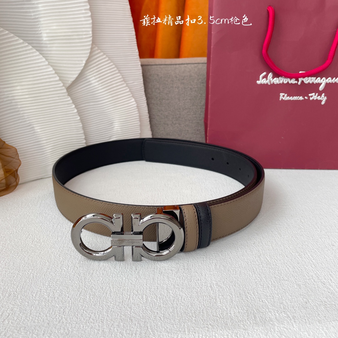 Ferragamo Men’s Double Gancini Buckle Reversible Belt In Khaki/Black Calfskin With Gold/Silver/Gun Black Hardware 35mm