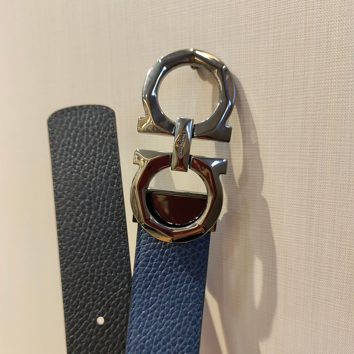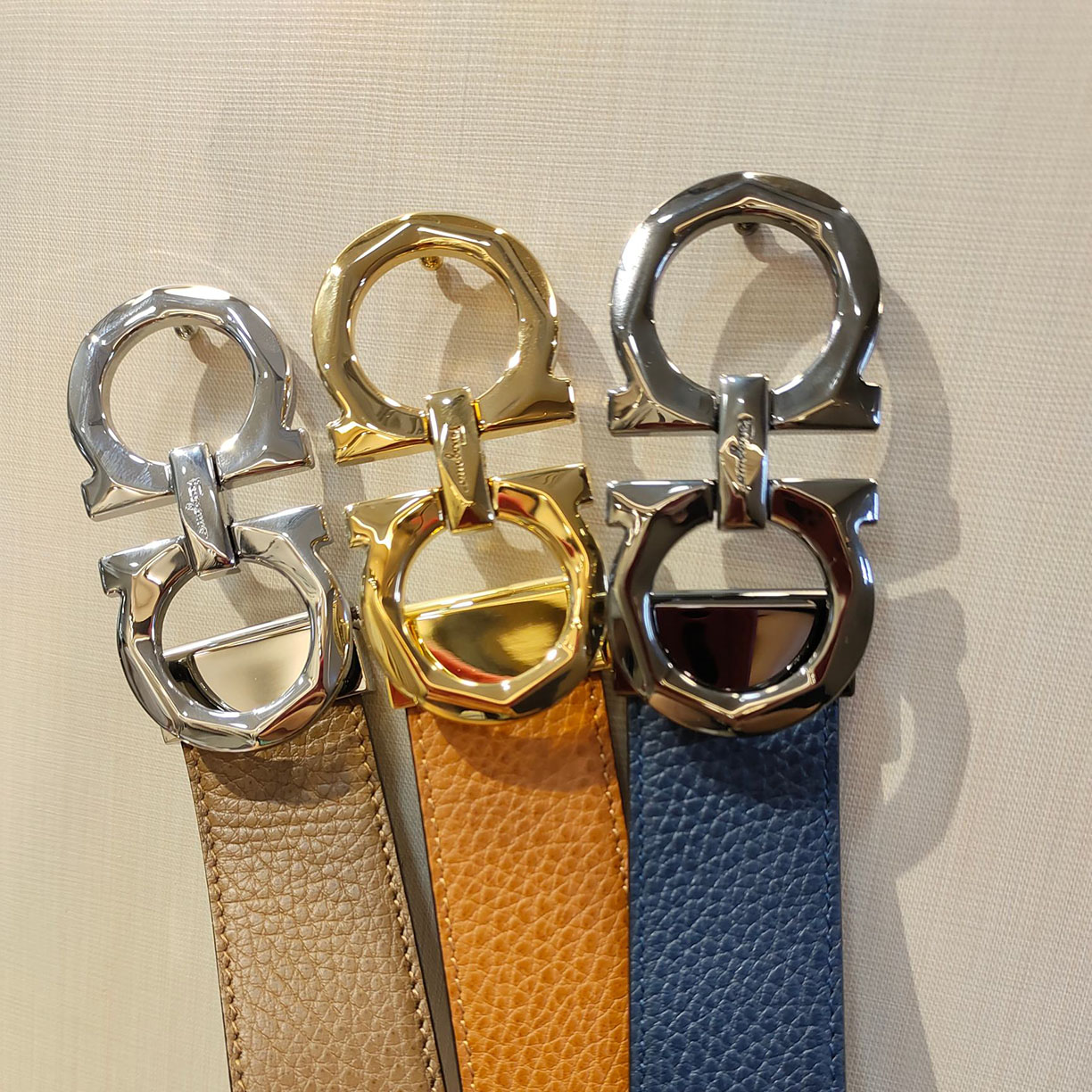 Ferragamo Men’s Double Gancini Buckle Reversible Belt In Orange/Black/Brown/Blue Grained Calfskin With Gold/Silver Hardware 35mm