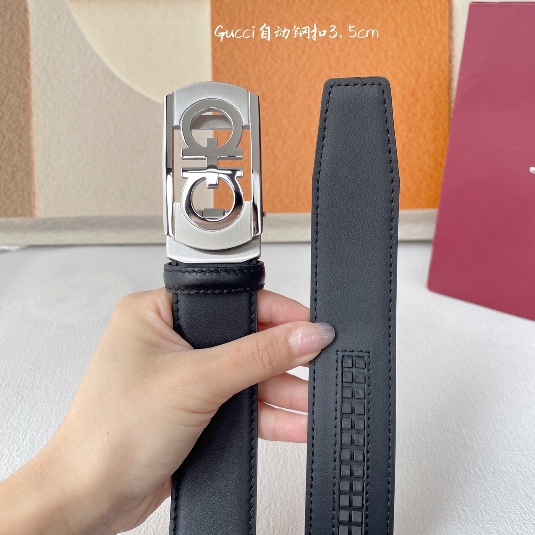 Ferragamo Men’s Rectangled Double Gancini Buckle Belt In Black Calfskin With Gold/Silver Hardware 35mm