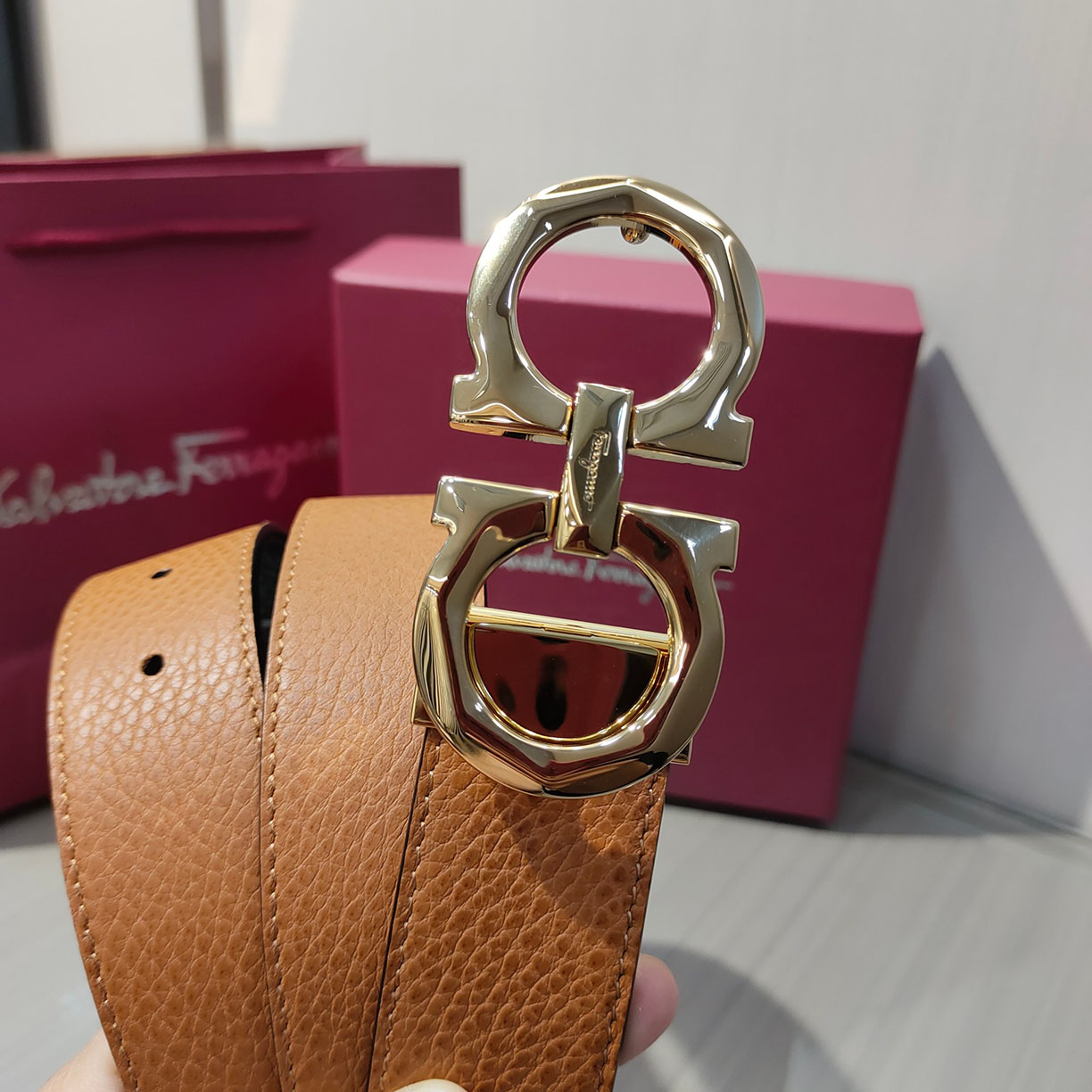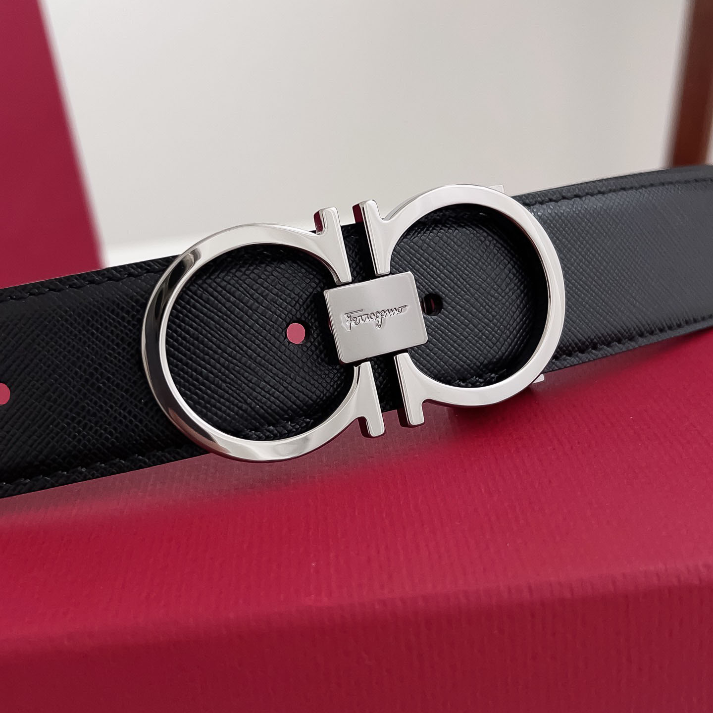 Ferragamo Women’s Double Gancini Reversible Belt In Red/Grey/Orange/Brown/Black Epsom Leather With Gold/Silver Hardware 25mm
