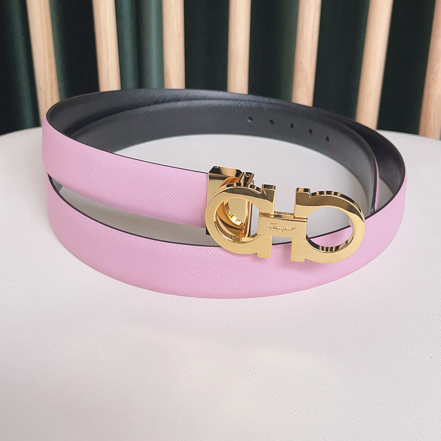 Ferragamo Women’s Double Gancini Reversible Belt In Blue/Pink/Red/Purple/Black/Brown/White/Navy Blue Calfskin With Gold/Silver Hardware 25mm
