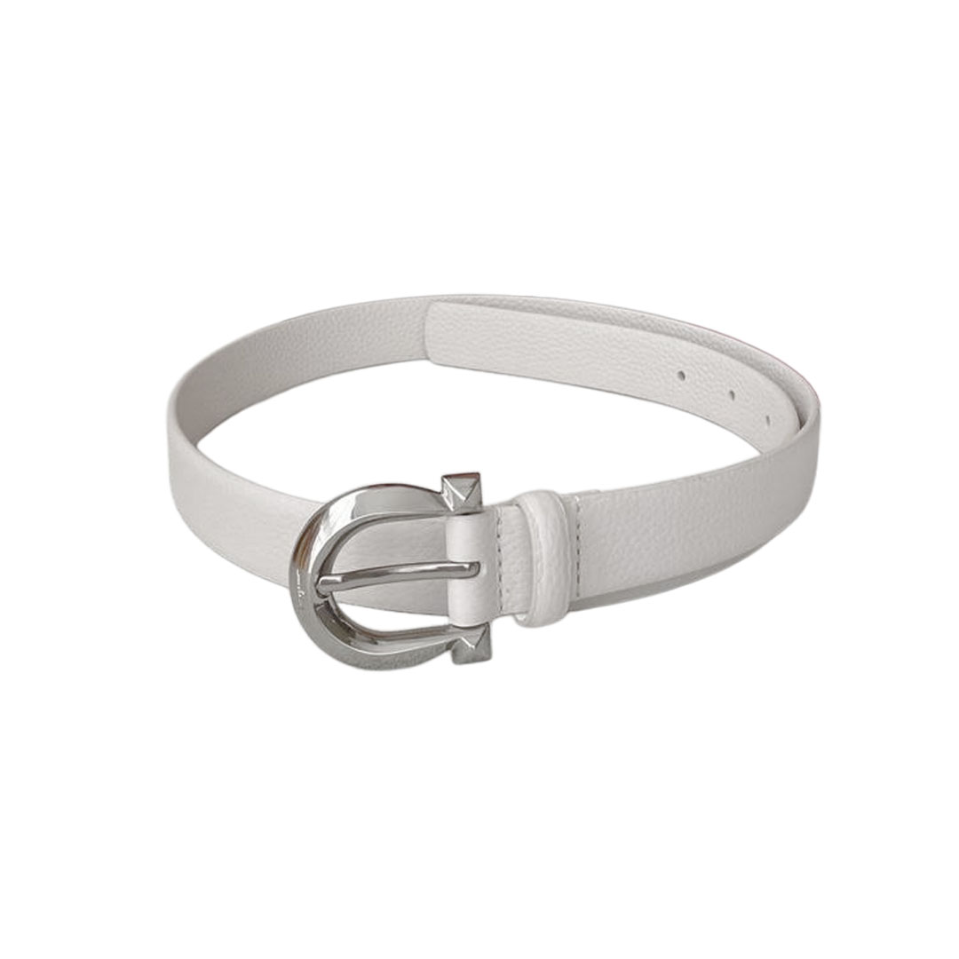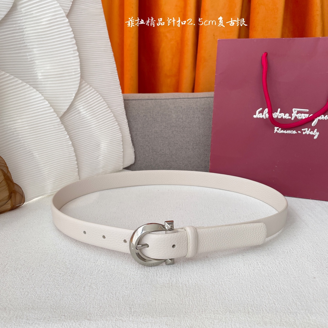 Ferragamo Women’s Fixed Gancini Belt In White/Black/Brown Calfskin With Gold/Silver Hardware 25mm