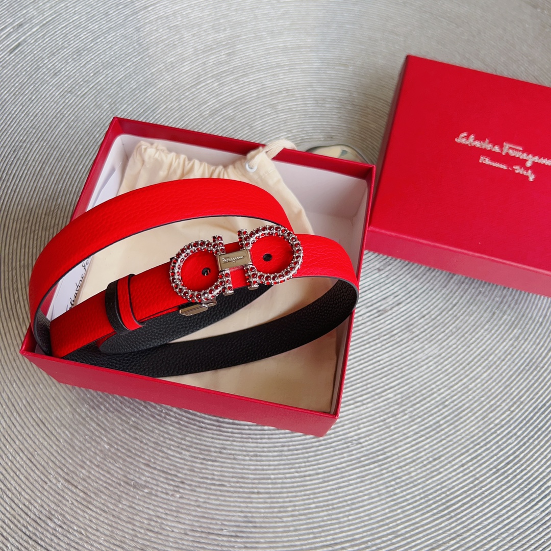 Ferragamo Women’s Double Gancini Buckle With Crystals Adjustable Belt In Red/Brown/Green/Pink/Black/White/Burgundy/Khaki/Celery Grained Calfskin With Gold/Silver Hardware 25mm