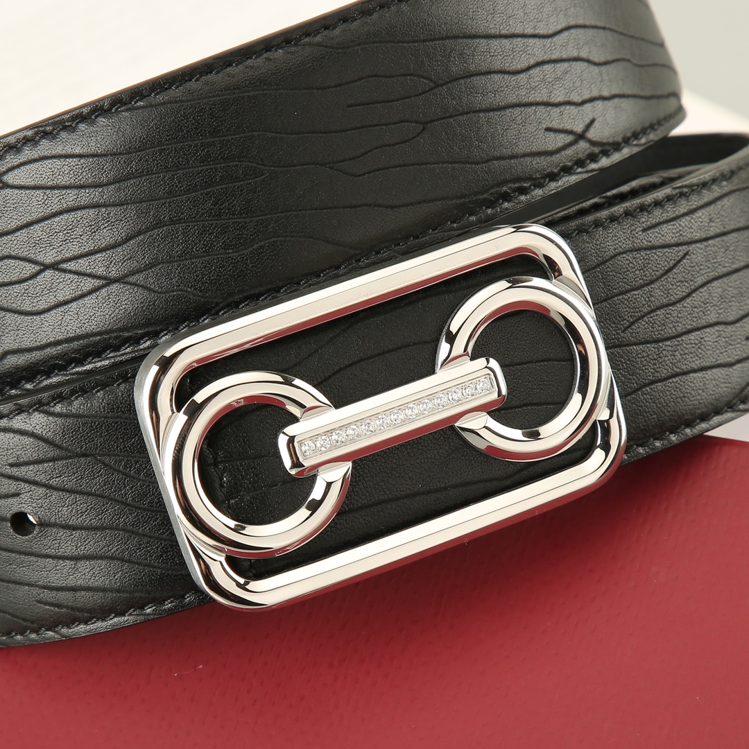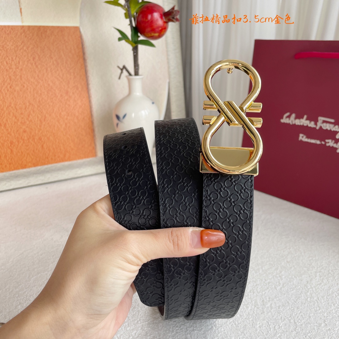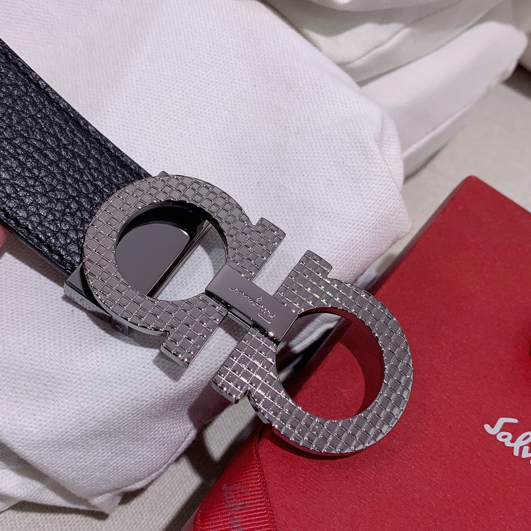 Ferragamo Men’s Hollow Double Gancini Buckle Belt In Black Calfskin With Gold/Silver Hardware 35mm