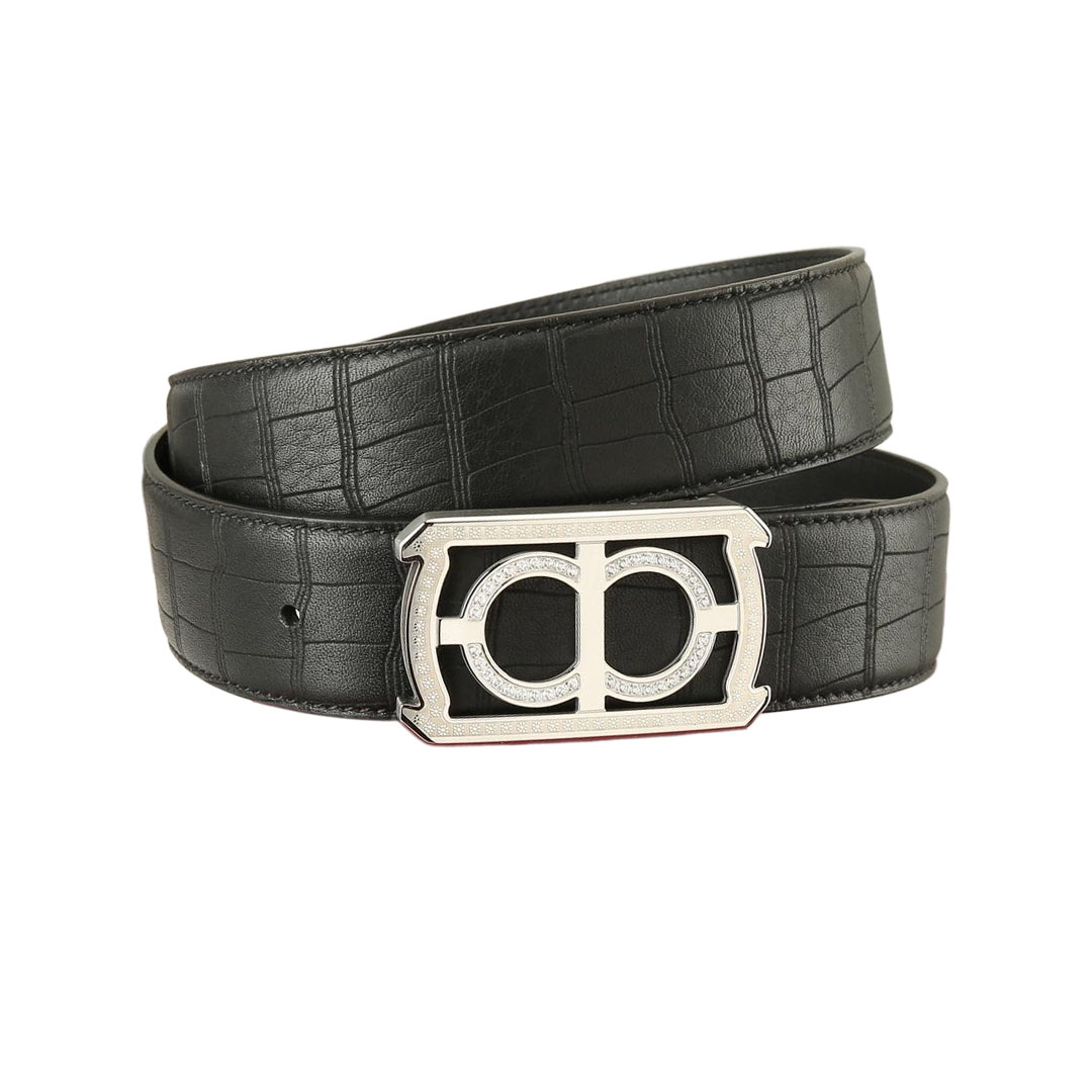Ferragamo Men’s Square Buckle With Crystal Belt In Black Crocodile-Embossed Calfskin With Gold/Silver Hardware 38mm
