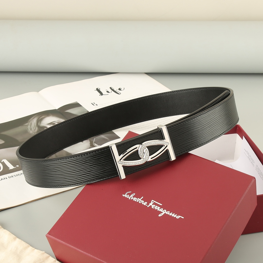 Ferragamo Men’s Square Buckle With Crystal Belt In Black Calfskin With Gold/Silver Hardware 38mm
