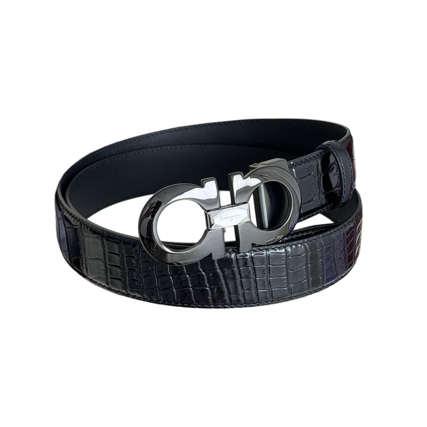 Ferragamo Men’s Double Gancini Buckle Reversible Belt In Black Crocodile-Embossed Calfskin With Gold/Silver/Black Hardware 35mm