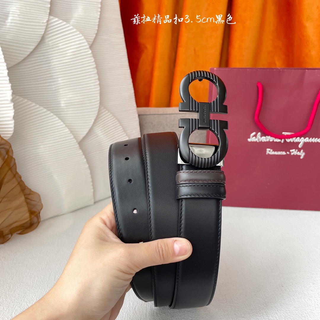 Ferragamo Men’s Square Buckle Belt In Black/Coffee Grained Calfskin With Gold/Silver Hardware 35mm