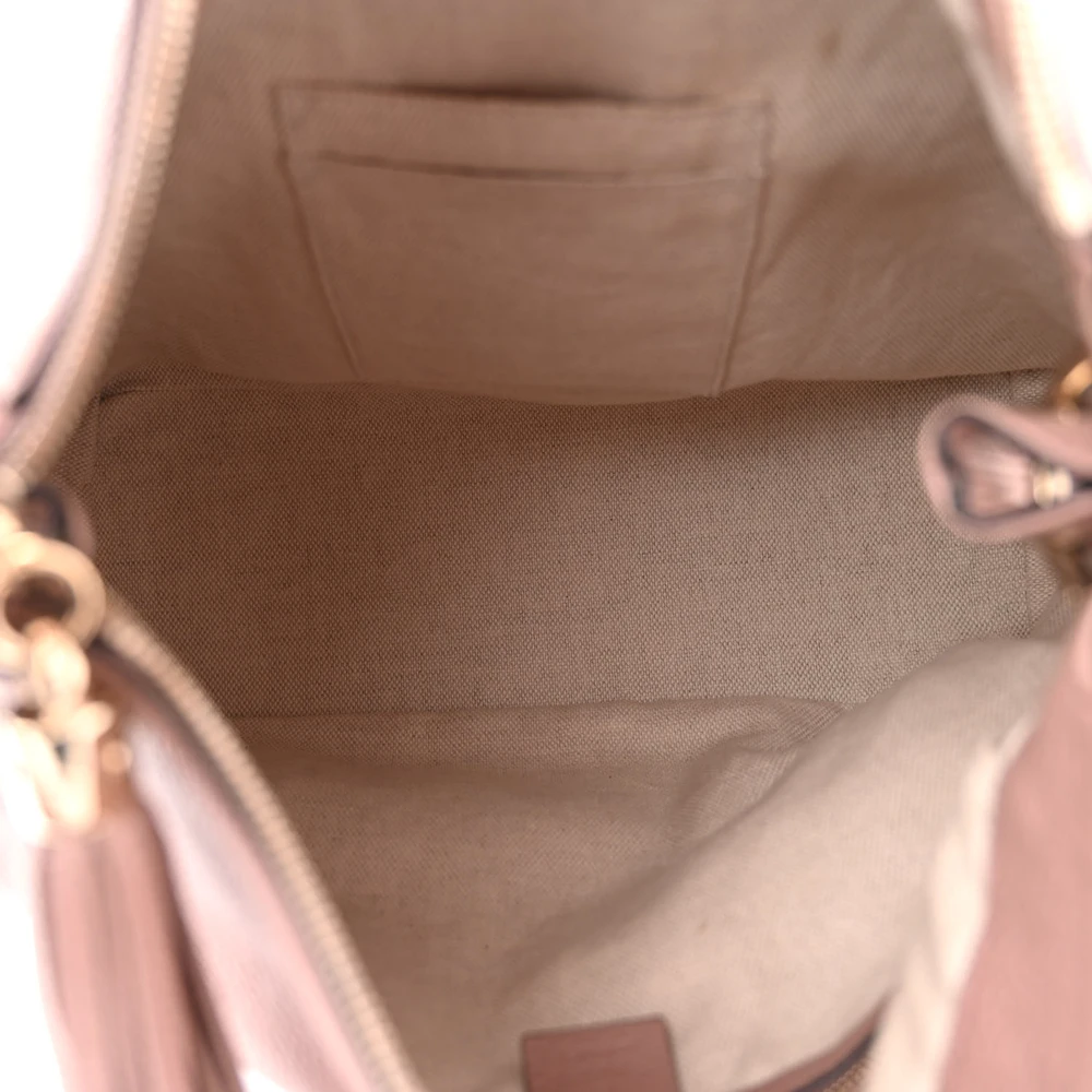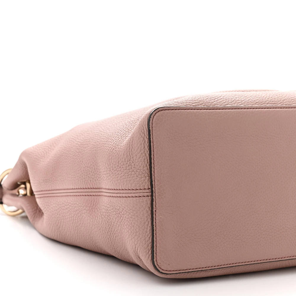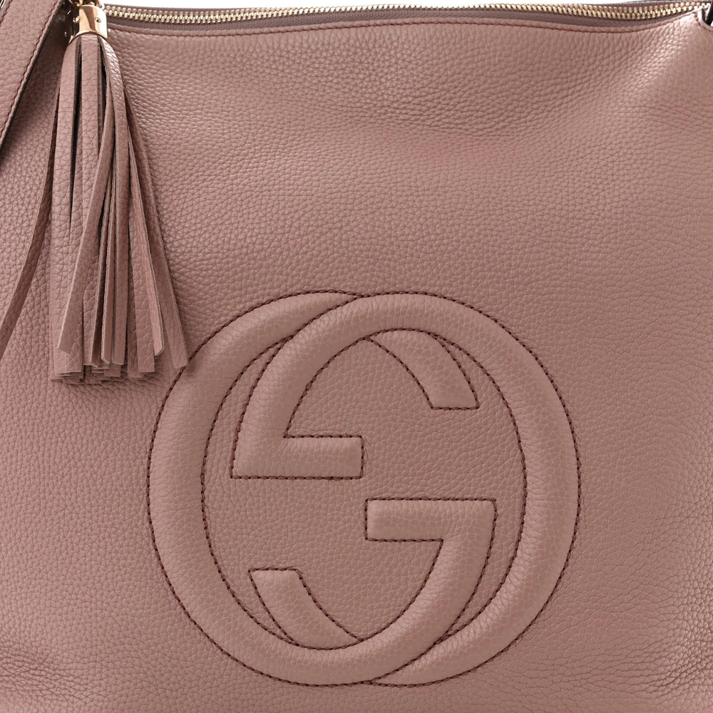 This Gucci Large Soho Hobo Bag features camelia pebbled calfskin leather. Brass hardware complements its soft, slouchy design. Spacious interior perfect for carrying essentials. A sophisticated choice for everyday wear. A blend of style and comfort.