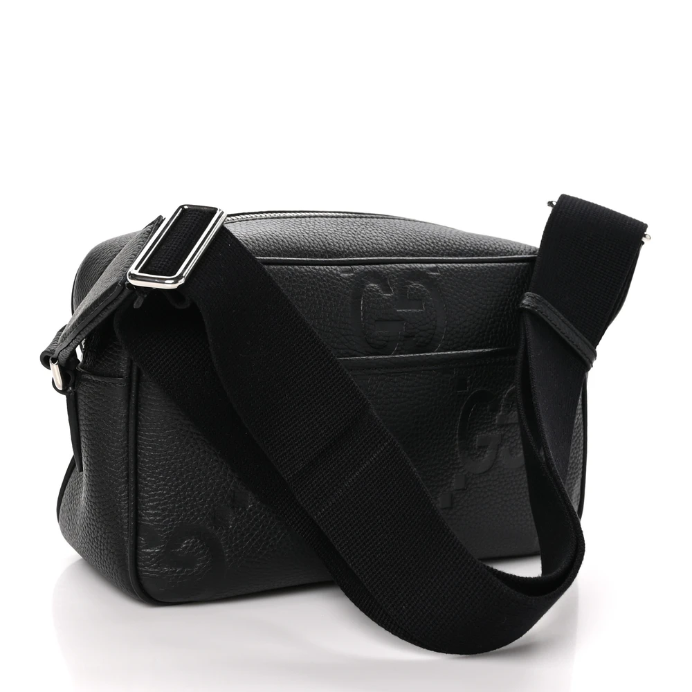 Gucci Medium Jumbo GG Messenger Bag Black Embossed Piuma Calfskin Leather Silver Hardware