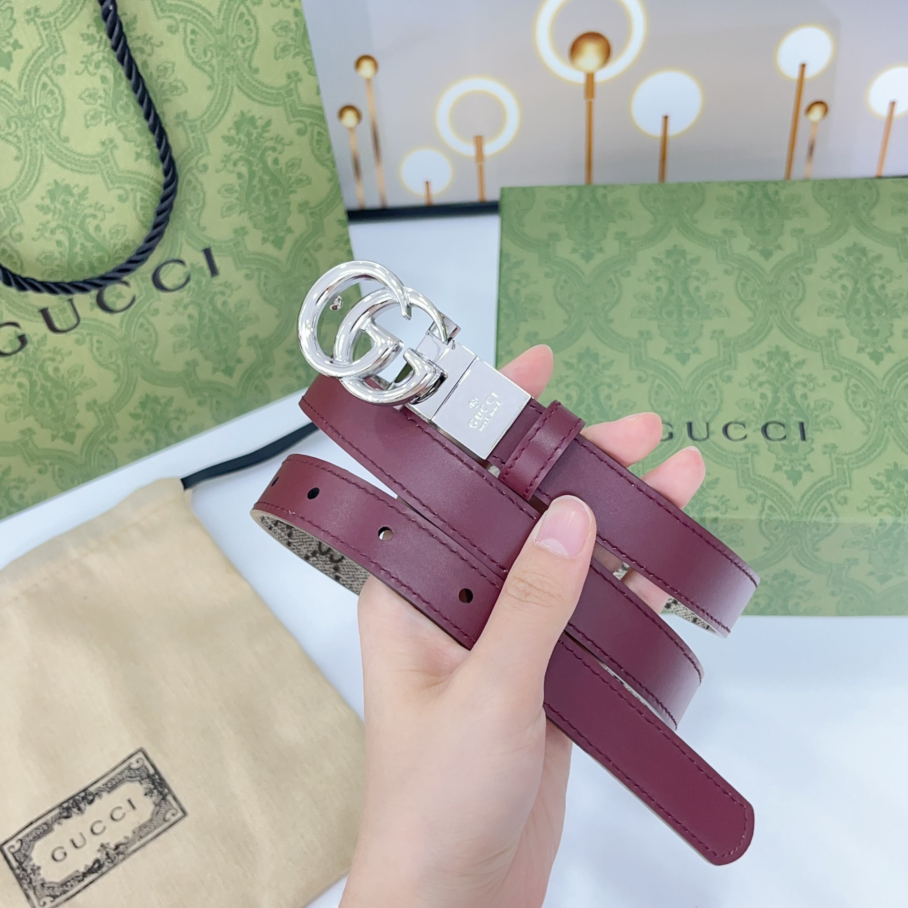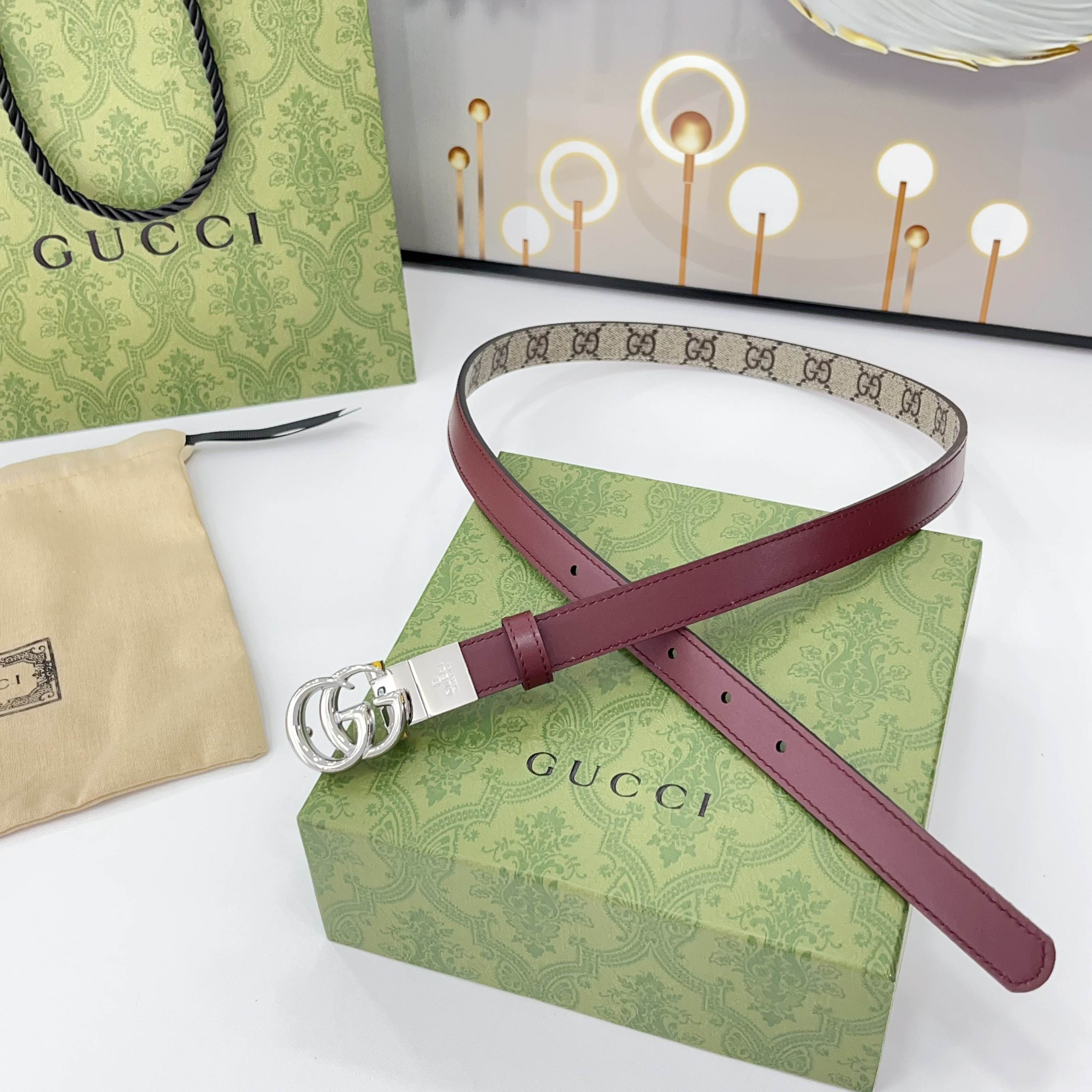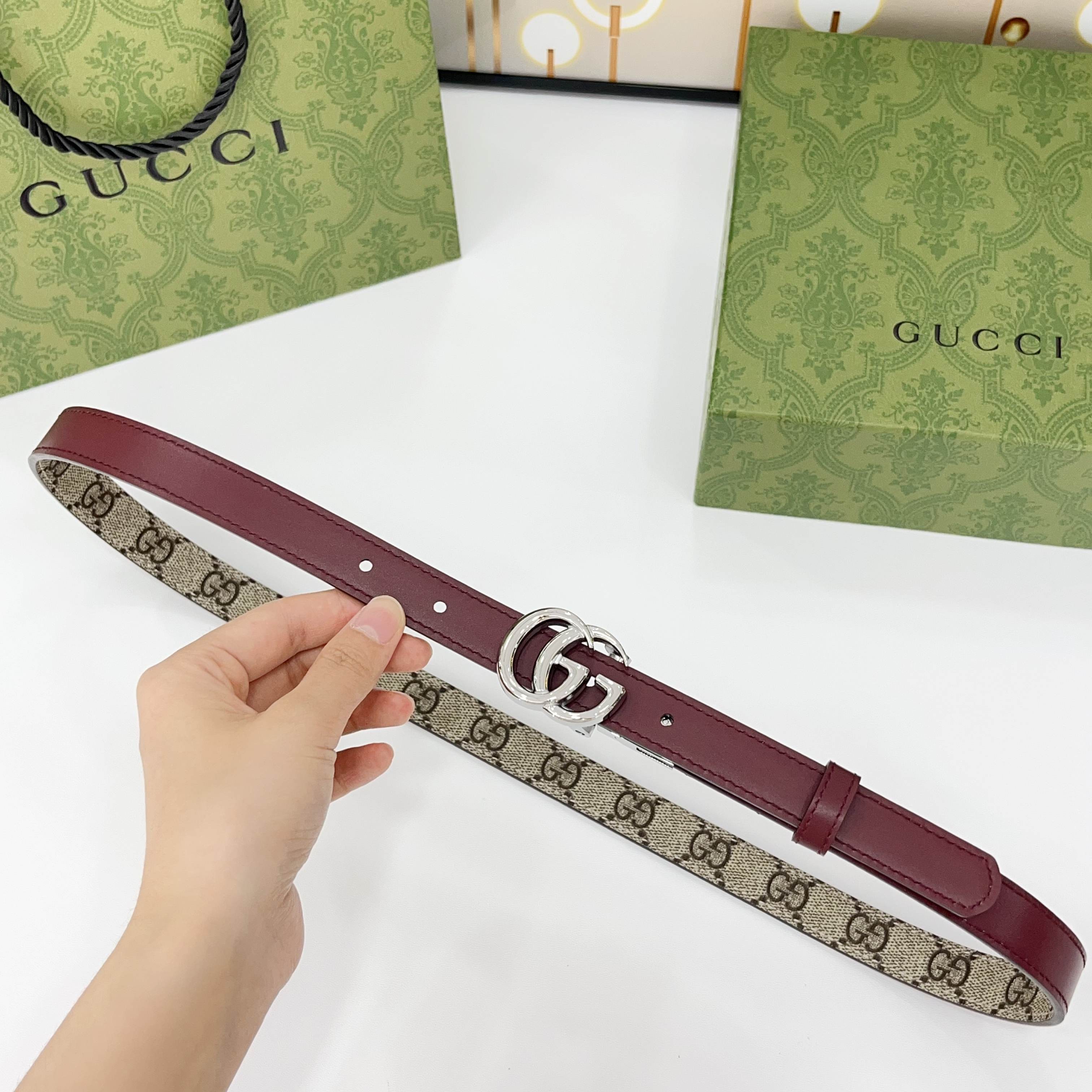 Gucci Women’s GG Buckle Marmont Reversible Belt In Red Calfskin And Beige Canvas With Gold/Silver Hardware 20mm