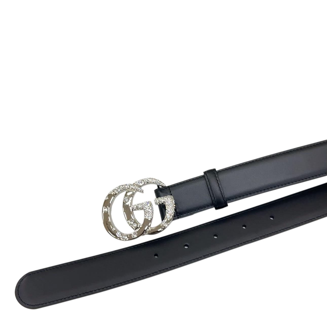 Gucci Women’s GG Buckle With Crystals Elastic Belt In Black Calfskin With Silver Hardware 30mm/40mm