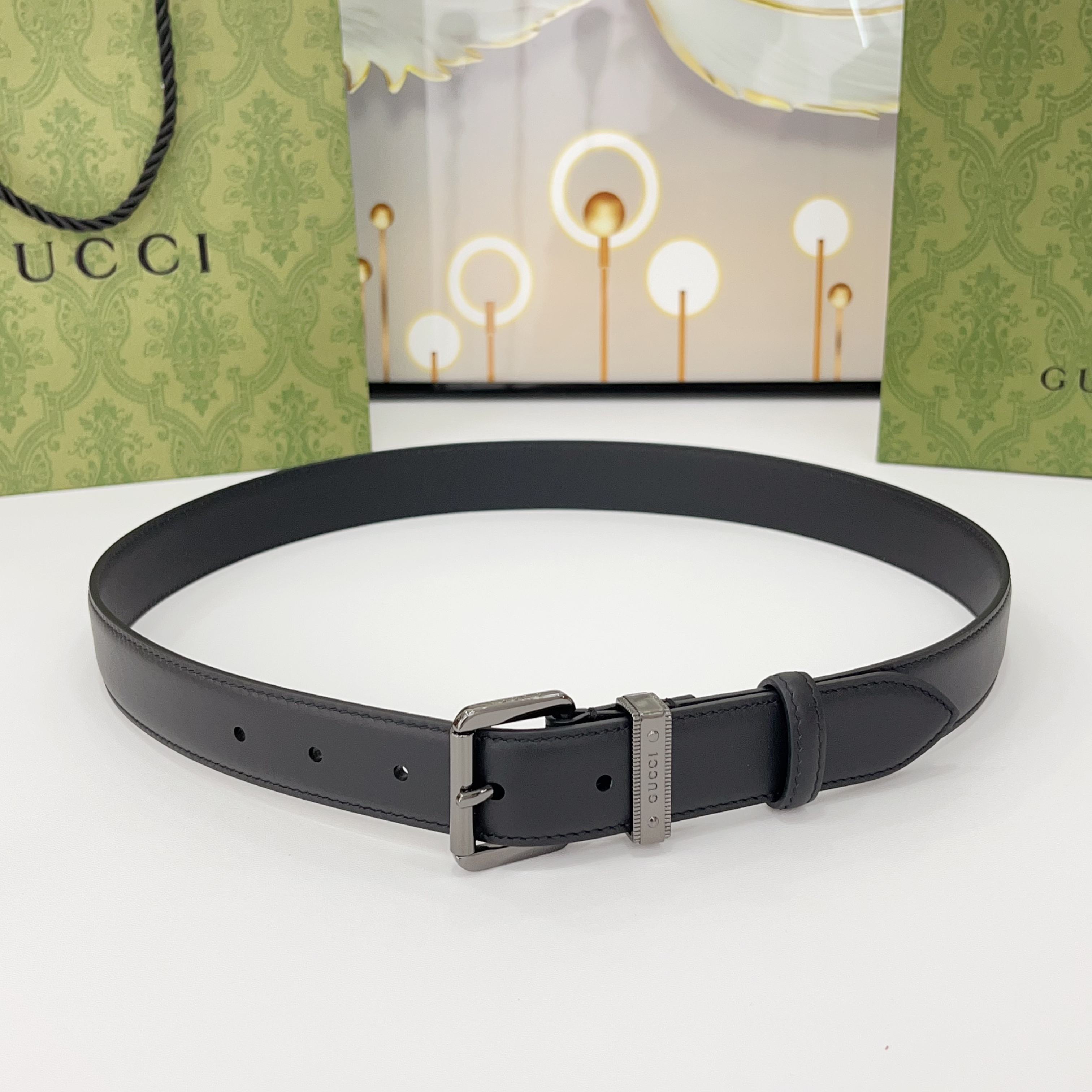 Gucci Men’ s Square Buckle Belt In Black GG Grained Calfskin With Gold/Silver Hardware 35mm
