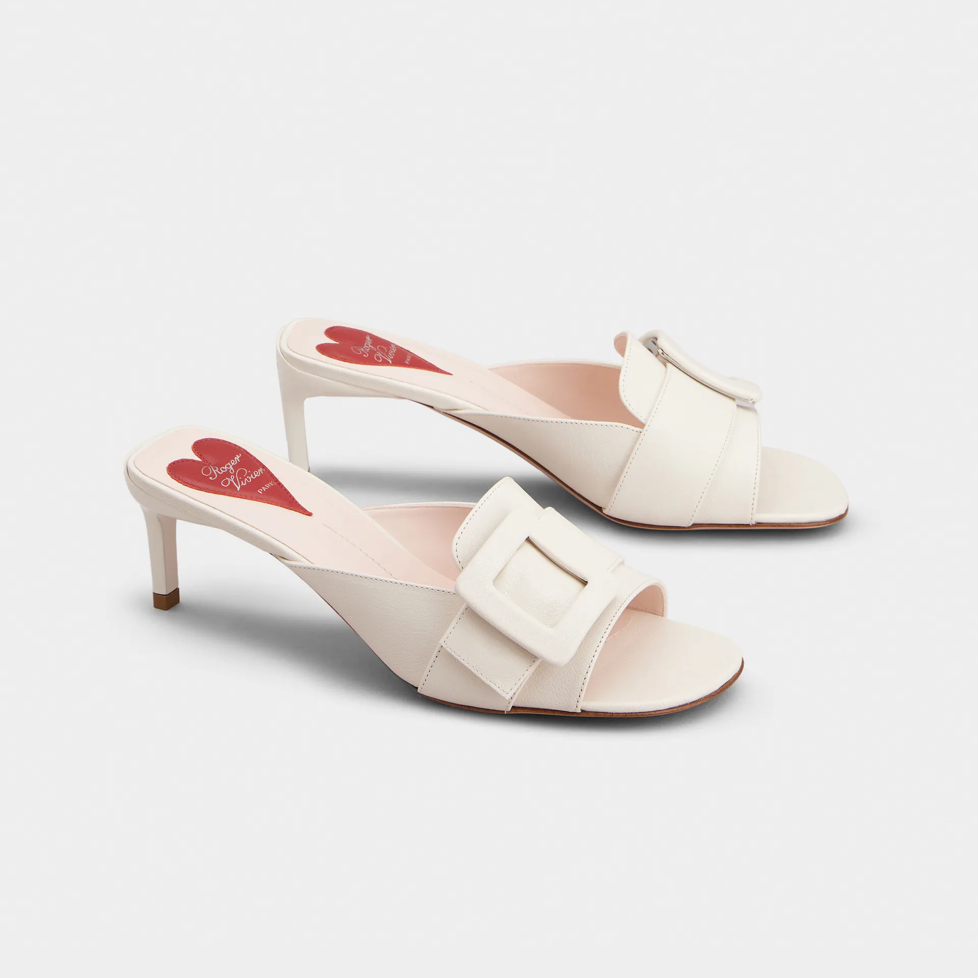 • Roger Vivier Viv�� Canard Mules Sandals In White Leather With Lacquered Metal Buckle (Heel Height 5.5cm)