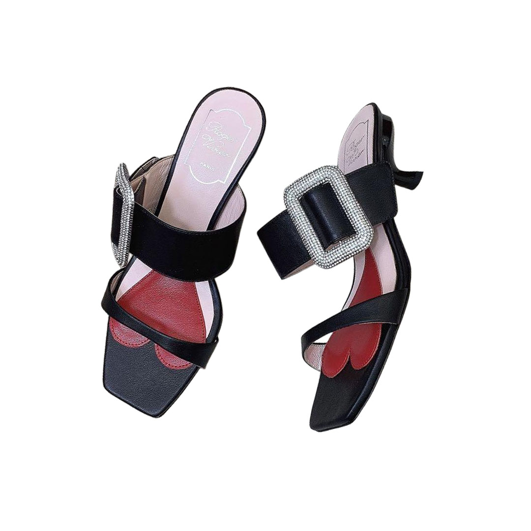 • Roger Vivier Viv�� Rangers Mules Sandals In White/Black/Blue Leather With Crystal Buckle (Heel Height 5.5cm)
