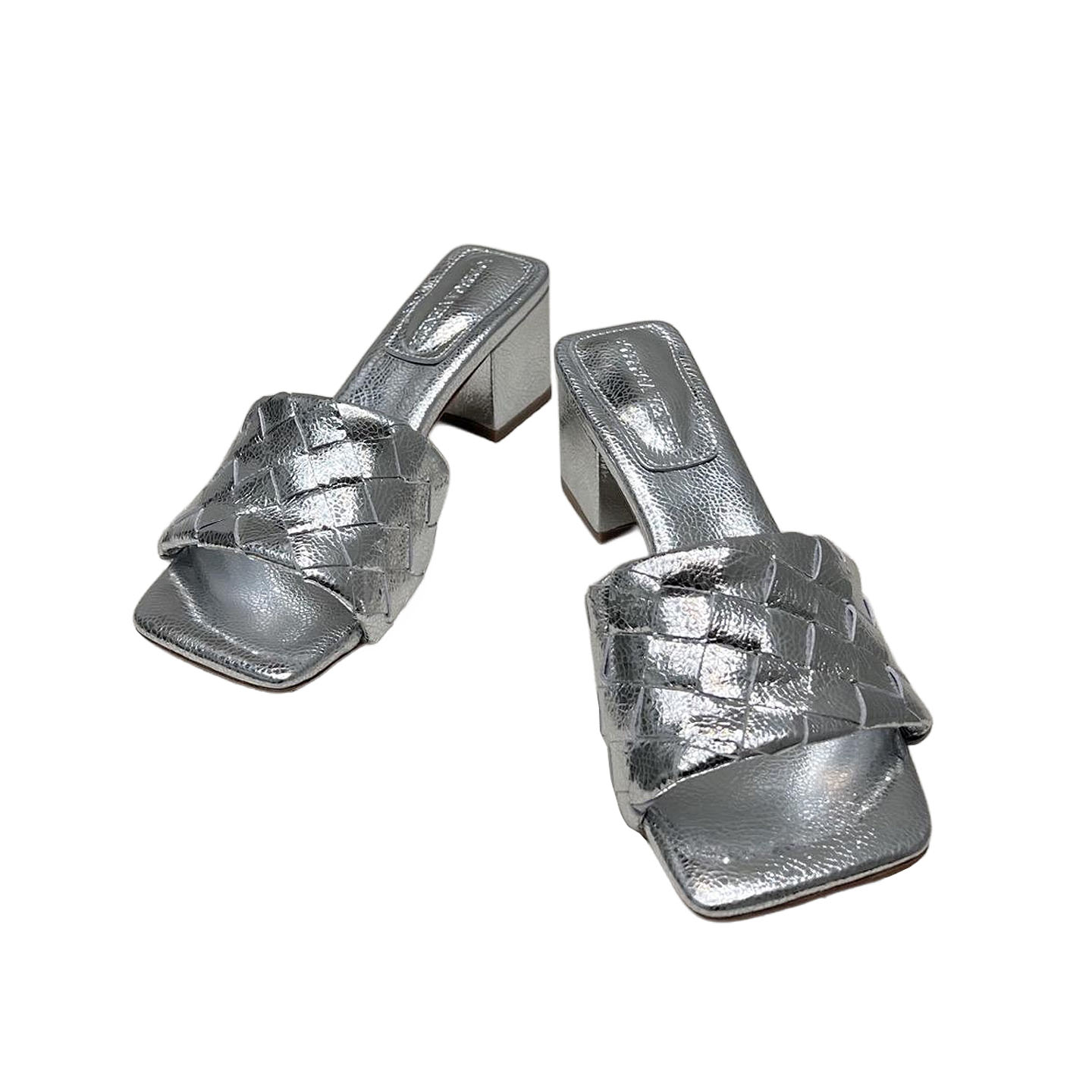 Bottega Veneta Parco Mule In Silver Intrecciato Leather Mule (Heel Height 9cm)