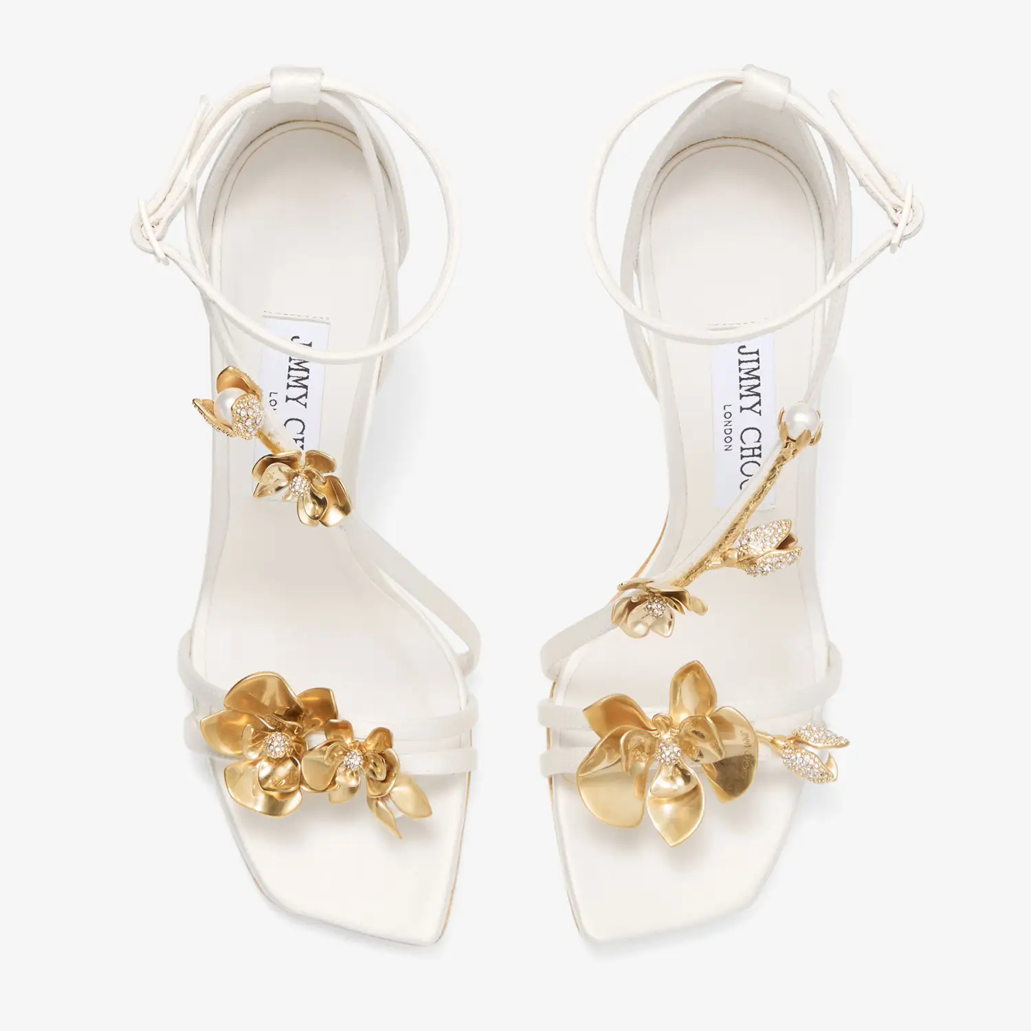 JIMMY CHOO Metallic floral embellished ivory white satin heel sandals