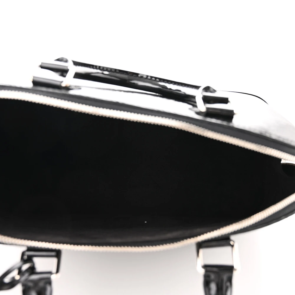 This Louis Vuitton Electric Epi Alma MM in Black is a sophisticated statement piece crafted from glossy black Epi leather. Patent leather details and silver hardware add a refined, contemporary edge to its iconic design. The dual zipper closure opens to reveal a black microfiber interior with practical pockets. Its structured silhouette ensures durability while offering ample space for essentials. A versatile handbag for work or leisure, it seamlessly blends elegance with functionality. A timeless addition to any collection.