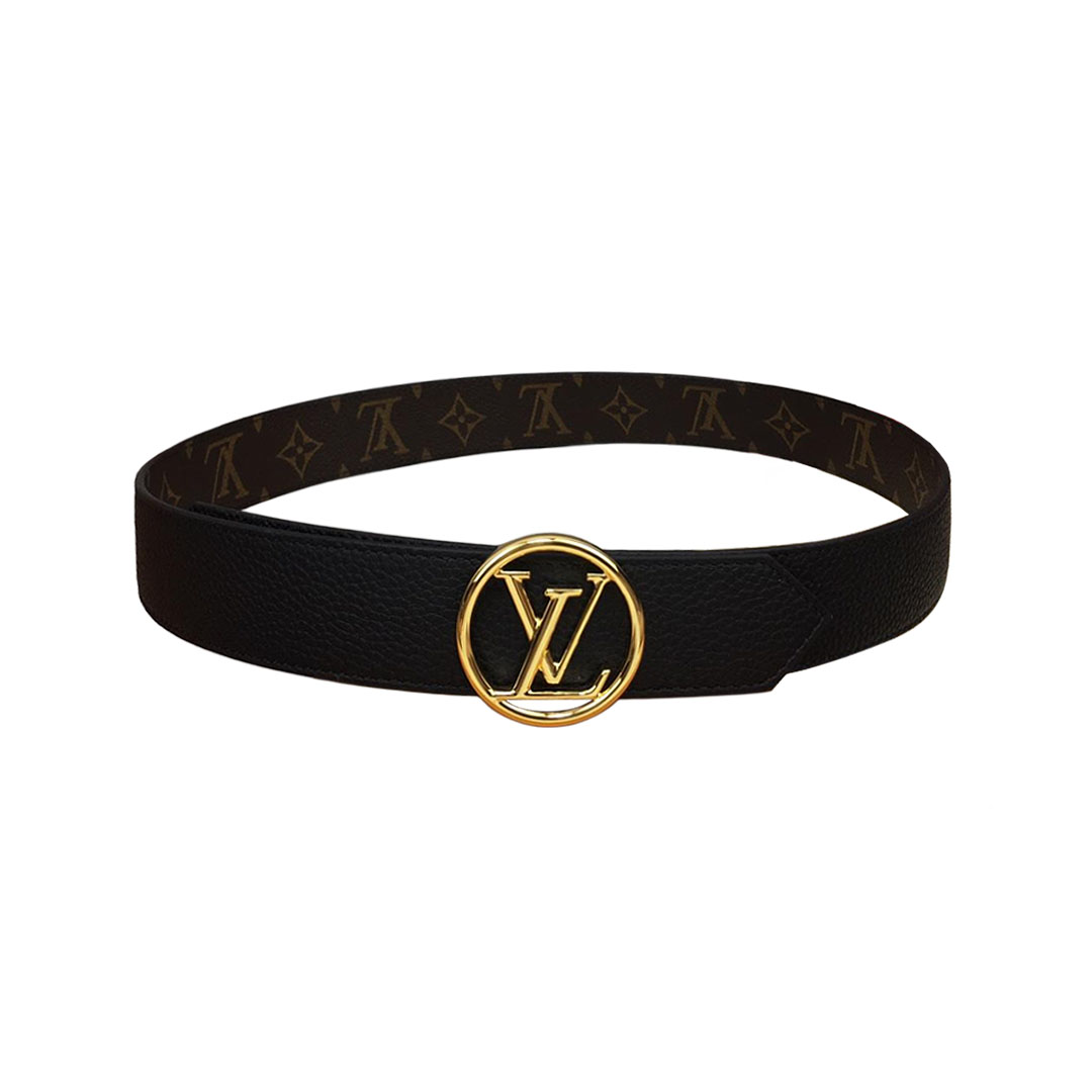 Louis Vuitton Women’s Circle Buckle Belt In Black Calfskin And Monogram Canvas With Gold Hardware 35mm
