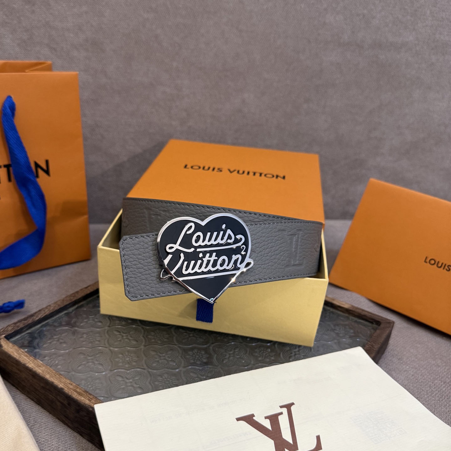 Louis Vuitton Men’s Shield LV Heart Buckle Reversible Belt In Grey/Black Calfskin With Silver Hardware 40mm