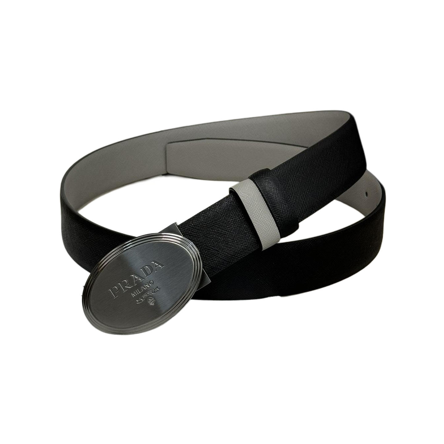 Prada Men’ s Oval Buckle Belt In Black/Brown/Burgundy/Grey Saffiano Calfskin With Gold/Silver Hardware 34mm