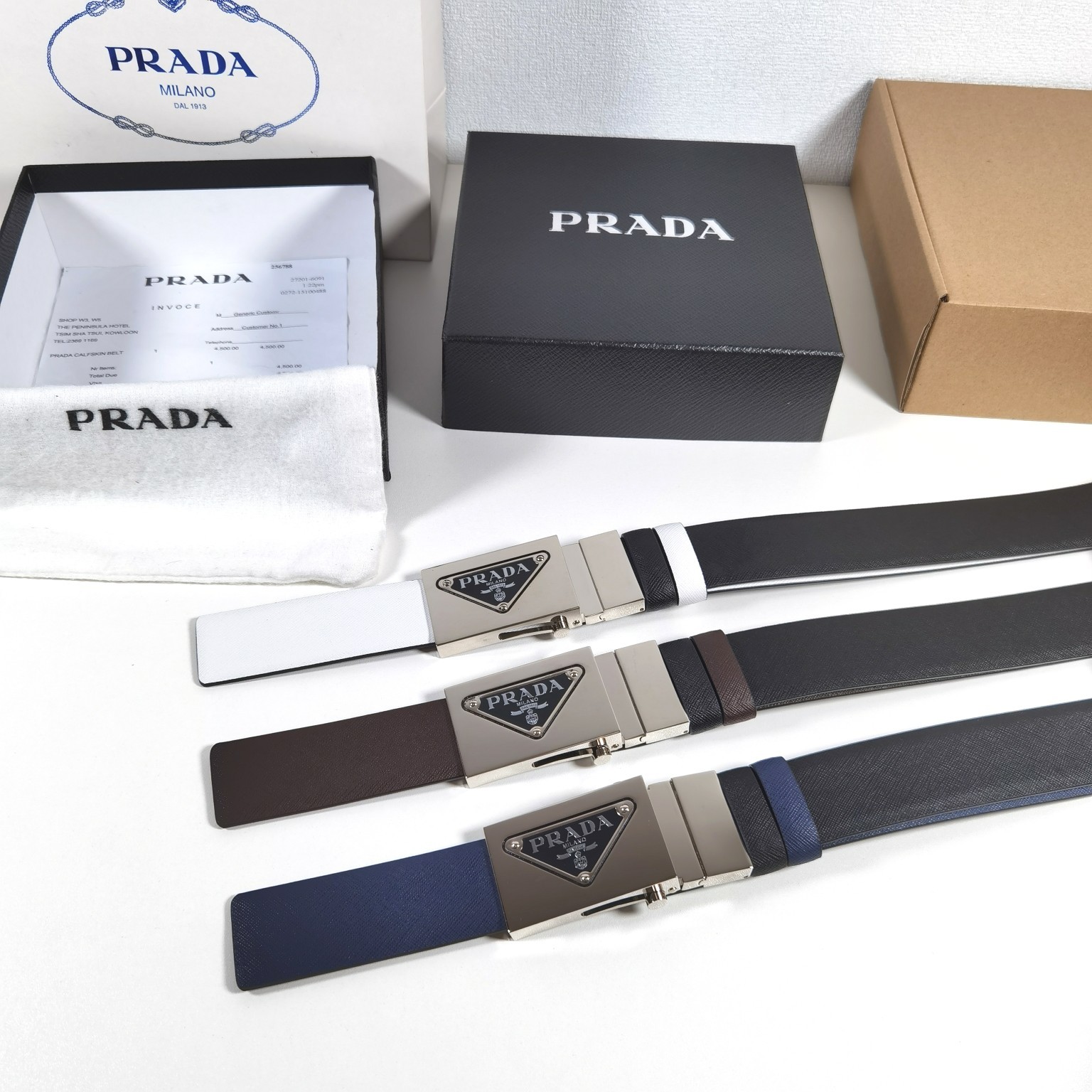 Prada Men’ s Square Buckle Belt In Black/Brown/Blue/White Saffiano Calfskin With Silver Hardware 35mm