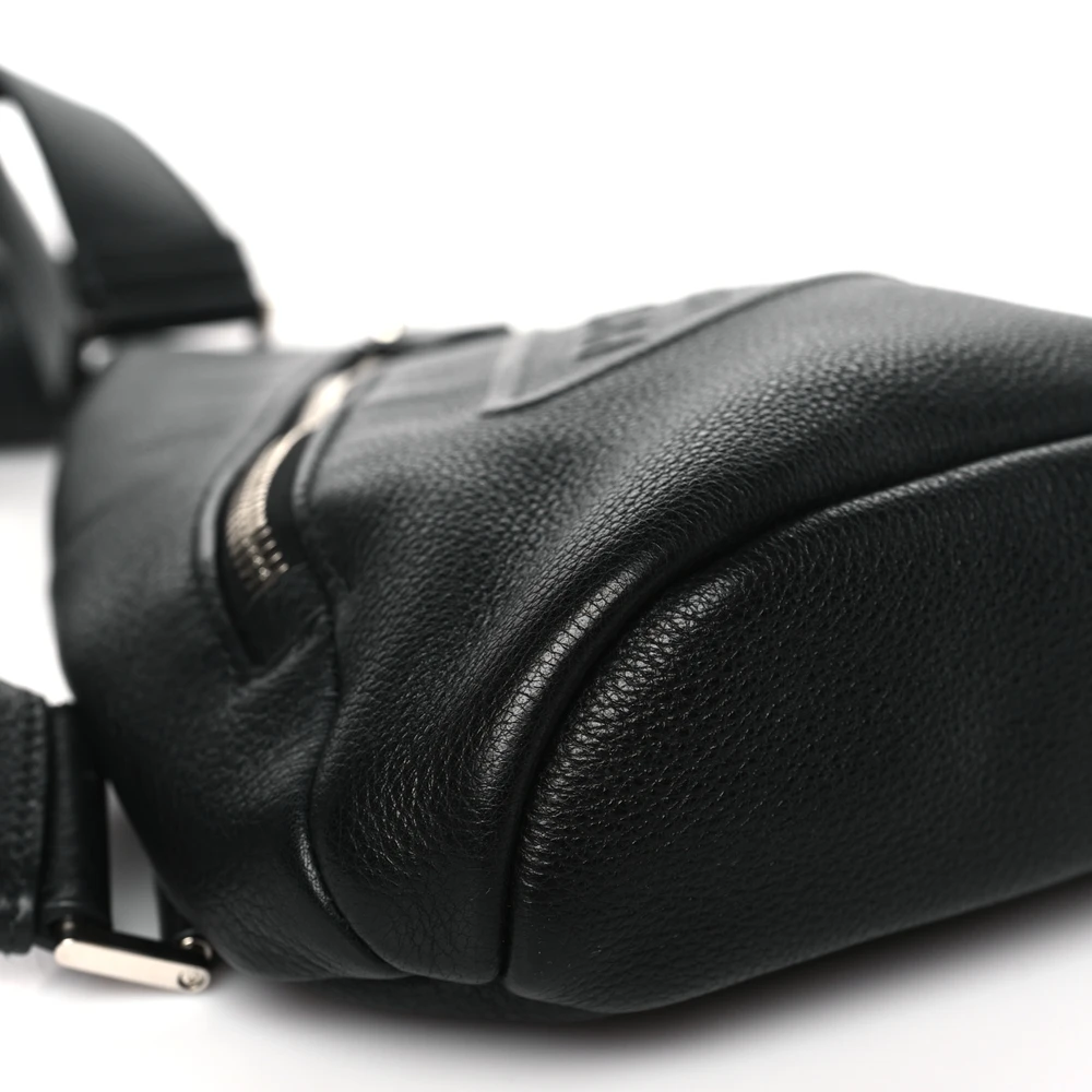 This Prada Medium Logo Embossed Cross Sling Backpack in Black features Vitello Daino leather. Silver hardware enhances its contemporary appeal. Spacious compartments offer practical storage. Adjustable straps ensure a comfortable fit. Perfect for work or casual use. A sleek and functional backpack.