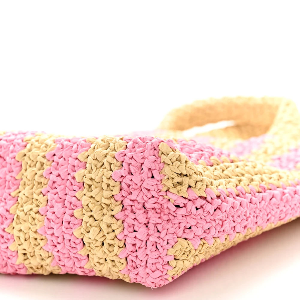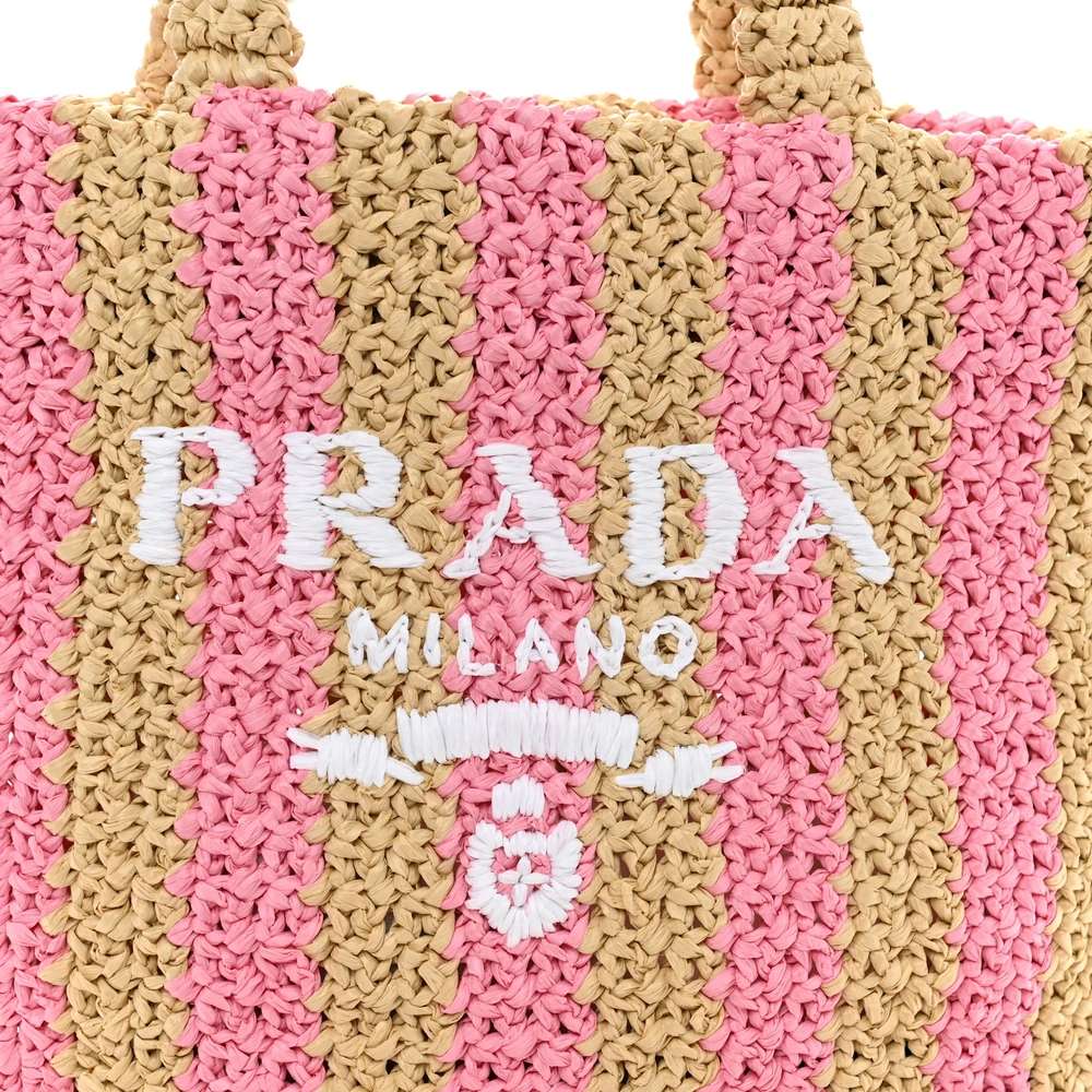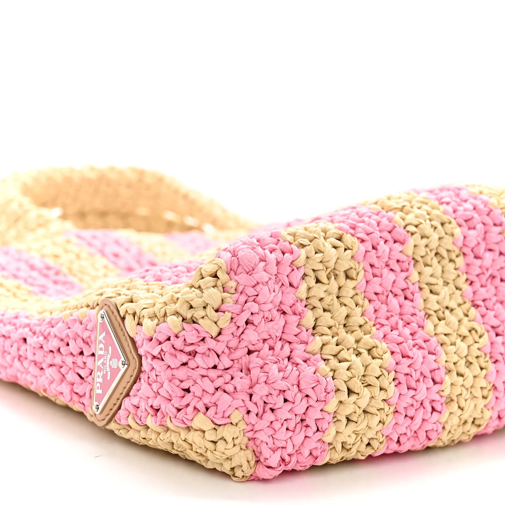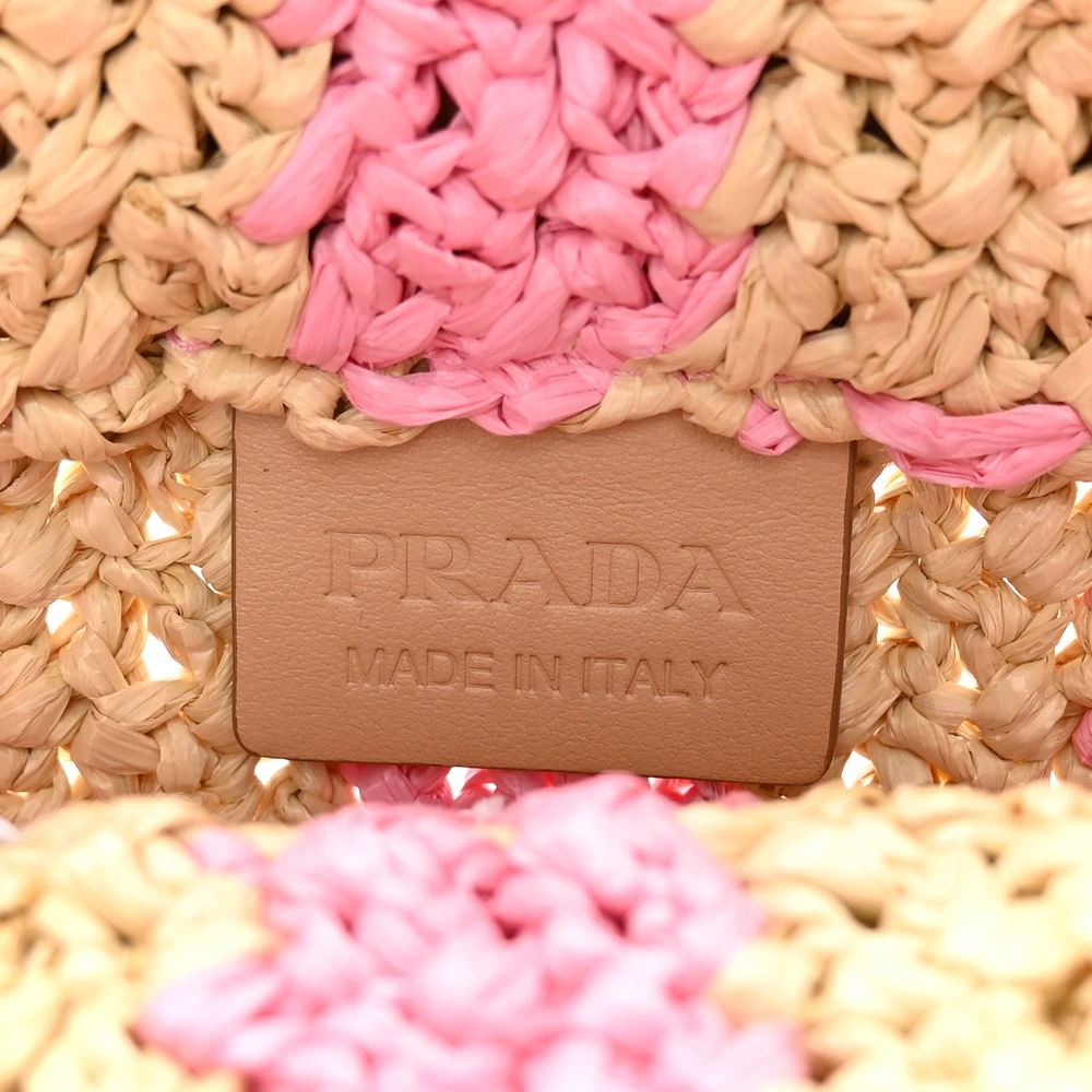 Prada Small Effect Crochet Striped Logo Tote Naturale/Petalo Yarn Raffia