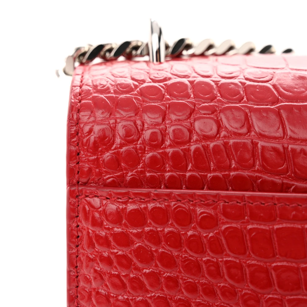 This Medium Sunset Bag in Rouge Eros features Embossed Monogram Calfskin & Crocodile Leather with silver hardware. The bold design includes a chain strap and a compact interior for essentials. The structured silhouette is accented by the iconic YSL logo, offering a sophisticated look. A statement piece for both casual and formal occasions.